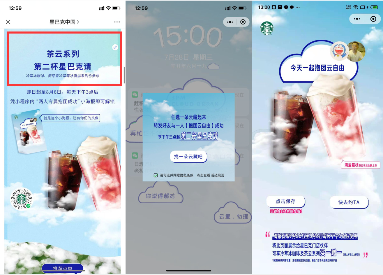 【星巴克买一送一杯】微信打开链接->如图点进去->自己两个微信号互相抱团即可->保存海报下午3点后到门店即可使用!出去玩可以安排下。