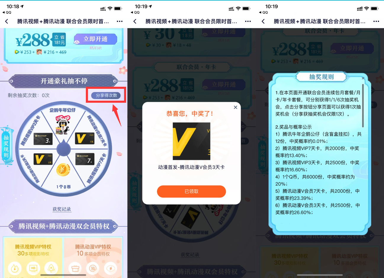 【简单抽腾讯视频 腾讯动漫会员】手Q打开->跳转腾讯视频APP->下拉找到“分享得次数”->简单分享下返回抽!亲测3天动漫会员。去抽看看。