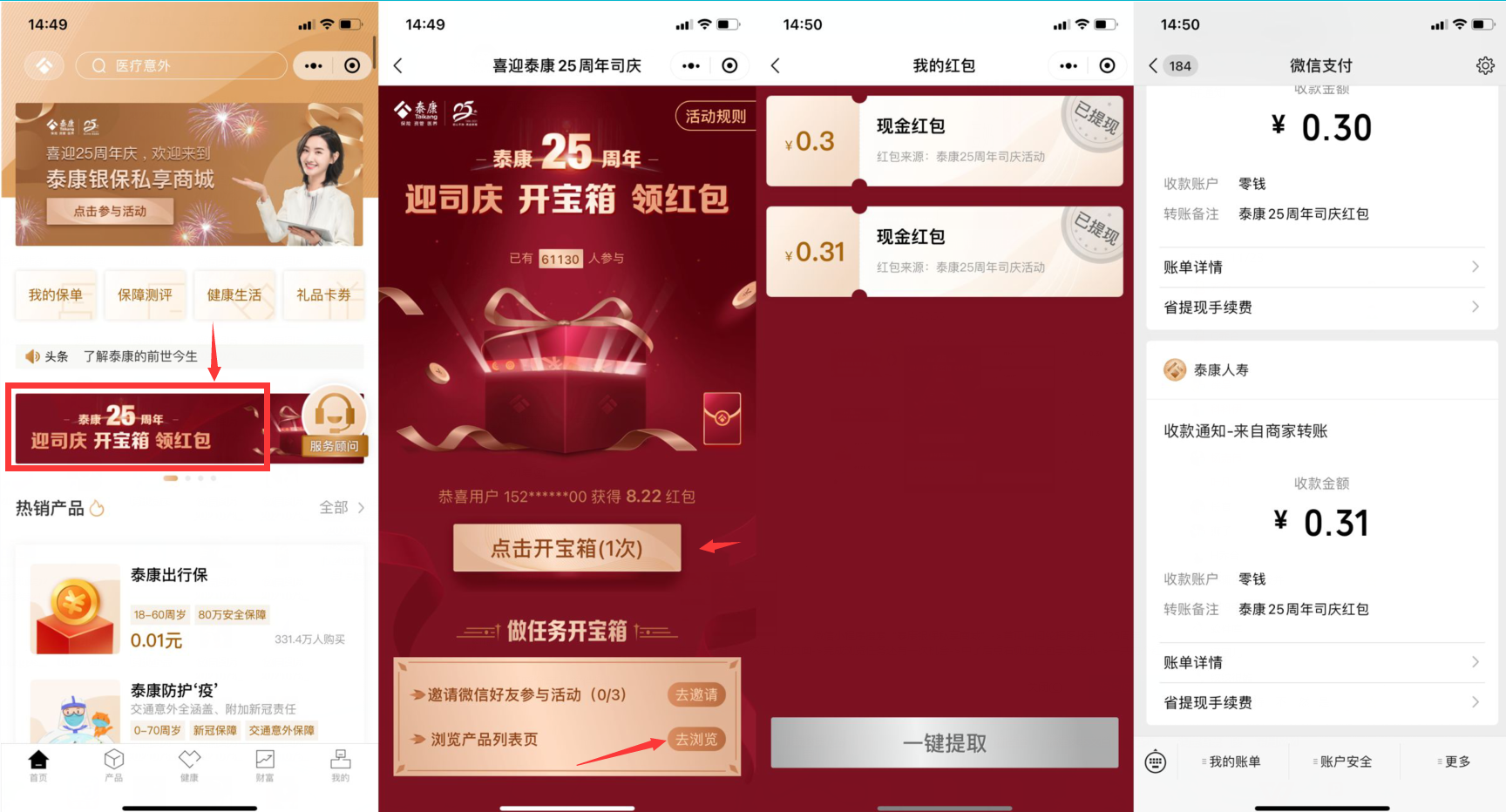微信小程序搜索“泰康银保私享商城”->首页中间轮播图找到“25周年”->进去开宝箱一次然后下拉页面->完成任务还有一次机会->中了后点右侧边红包手动提现->一共必中两个红包!