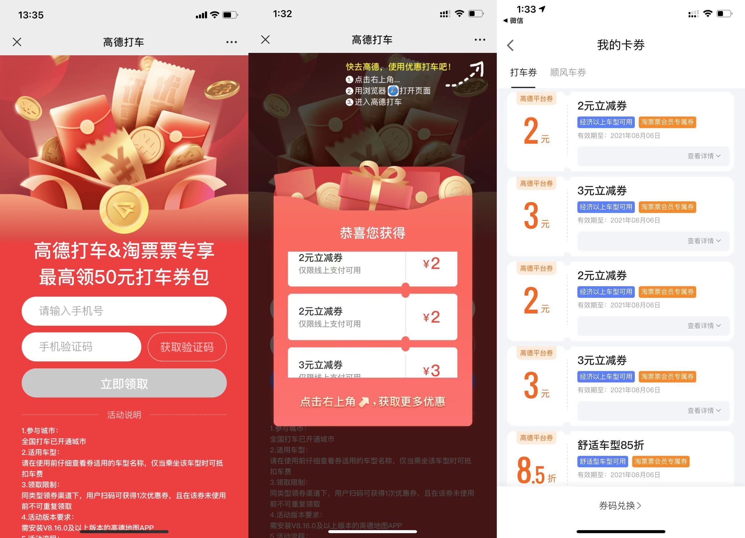 【免费领高德打车券包】打开立即领取即可->含2张2元立减券和3元立减券等等。出去玩需要的领上!