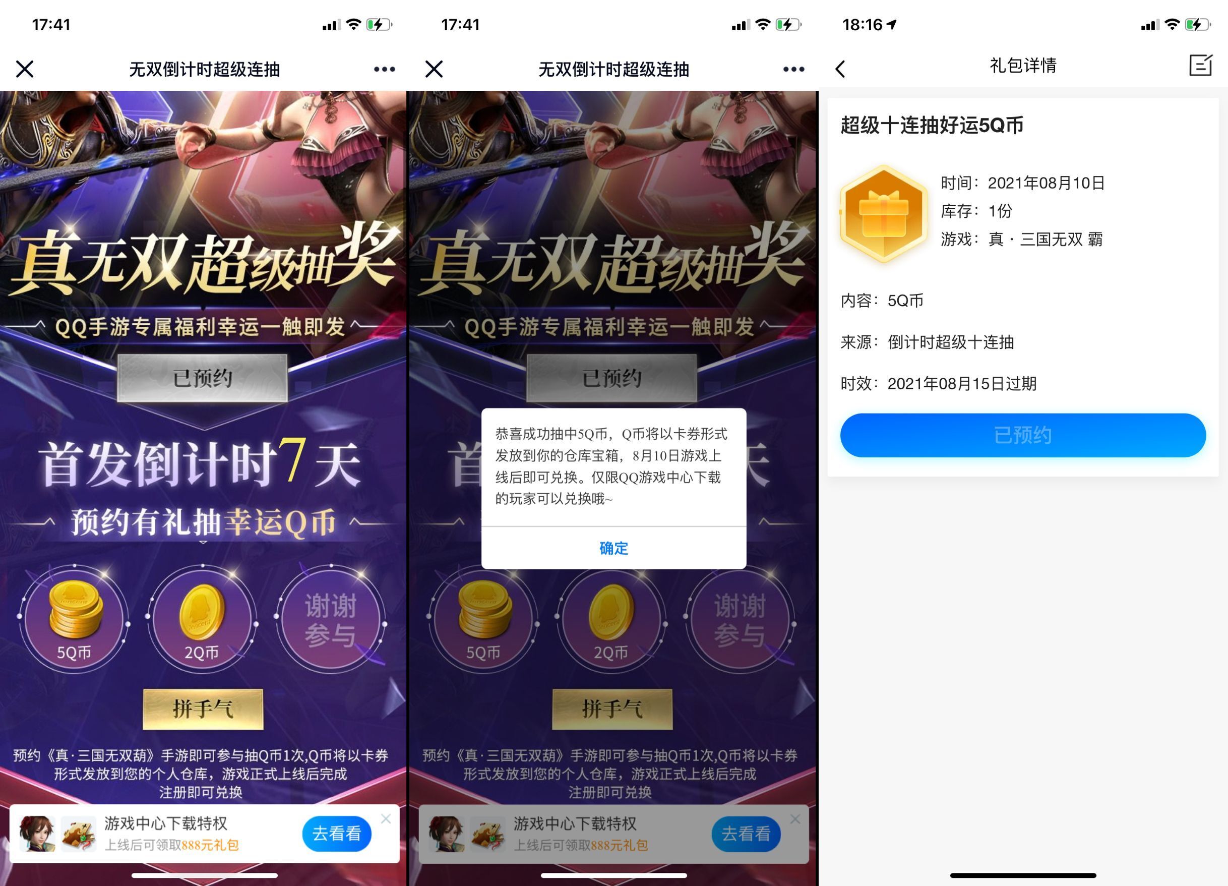 【无双手游抽2~5Q币卡券】手Q打开->点预约->再点拼手气抽!中了Q币卡券的等游戏上线即可兑换。