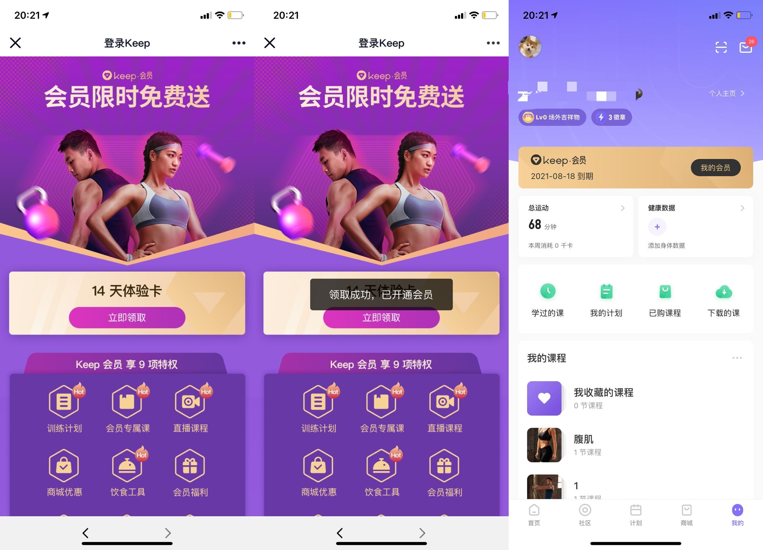 【免费领Keep运动健身会员14天】打开地址登录手机号后直接领取->限量2万份->如果提示领取失败就是领完了!
