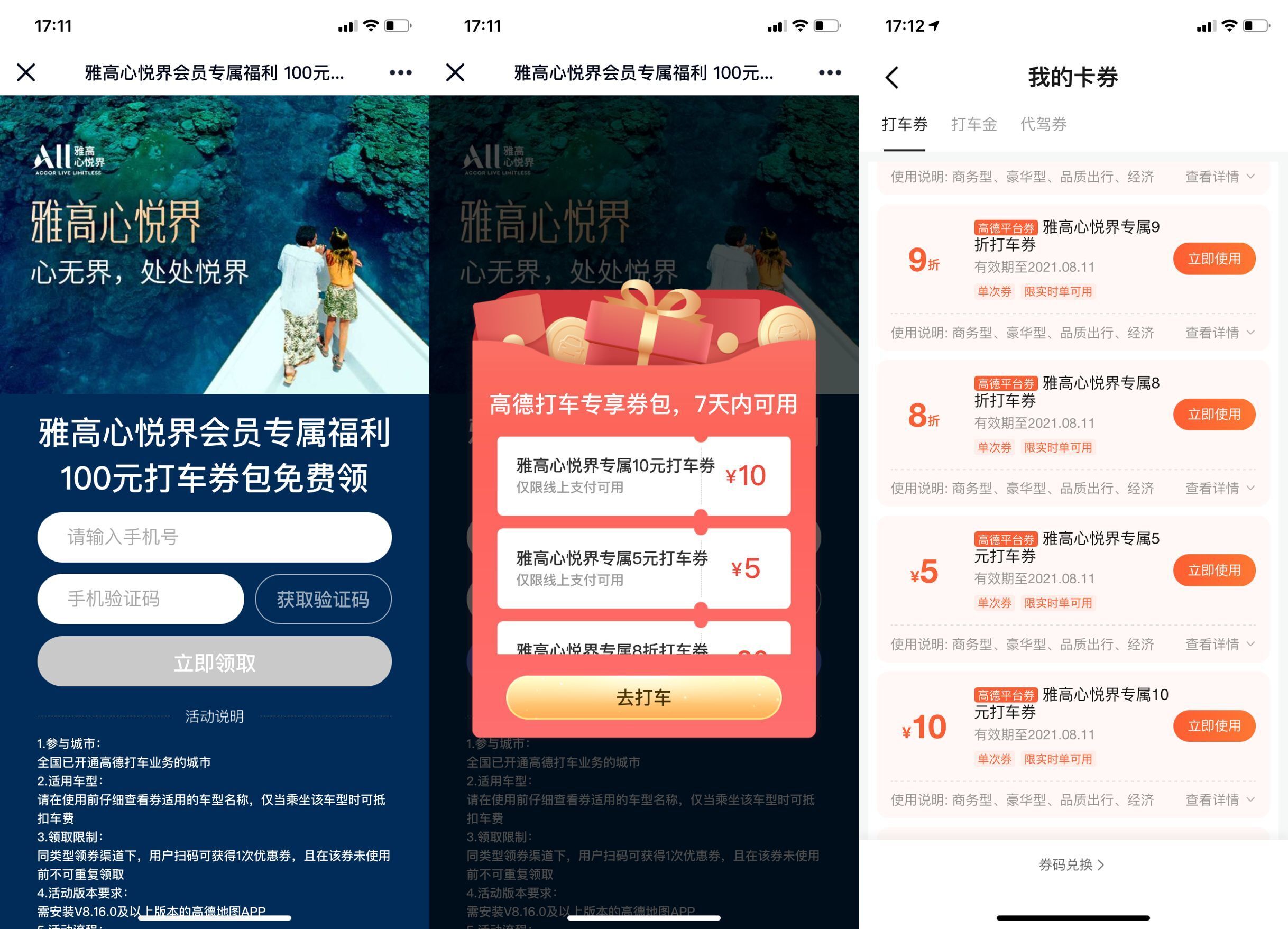 【免费领高德100元打车券包】打开登入领取即可->包含了直减券和多种折扣券->经常打车的领上防身,7天内使用即可!