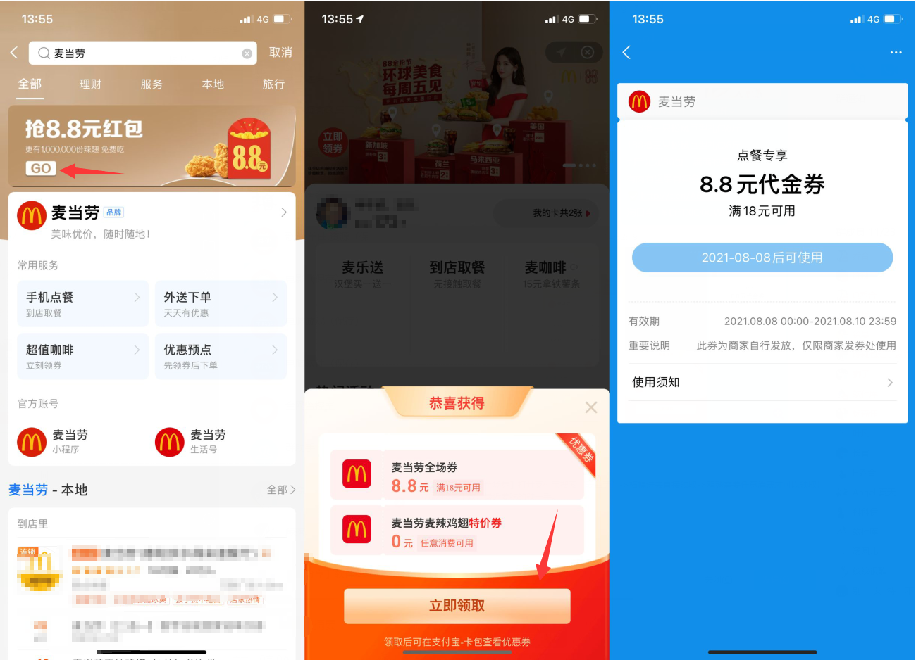 【0撸麦当劳8.88全场券】打开支付宝搜索“麦当劳”->横幅进去直接领取->鸡翅需要任意消费才可以领取!立减券8号生效!最近要吃的领一手。