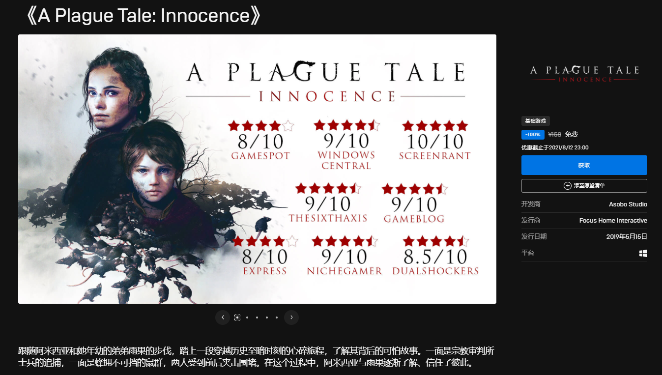 Epic本周喜加3免费领《瘟疫传说:无罪》《Minit》《战舰世界新手包》一个鼠疫题材的中文大作和一款奇特的冒险小游戏!