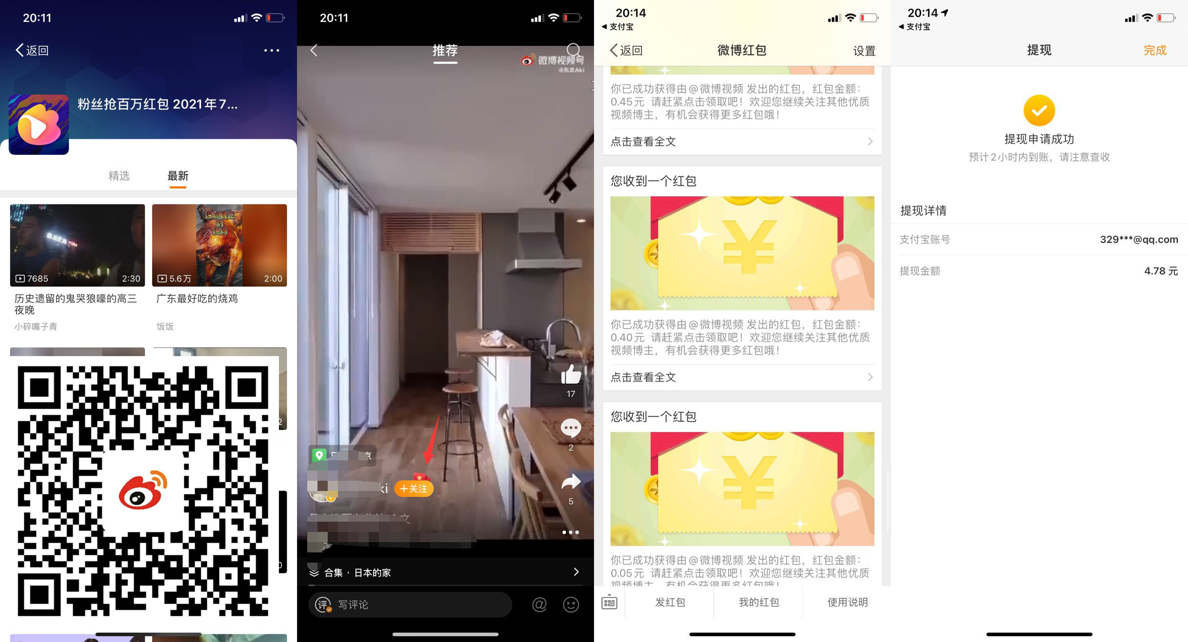 【微博关注视频号抽1~3元红包】打开微博APP->我->右上角扫码进入活动->随便点视频进去->点左下角关注->多关注点->提示很遗憾只能换号参加->然后去消息里拆开红包提现!再去取关即可