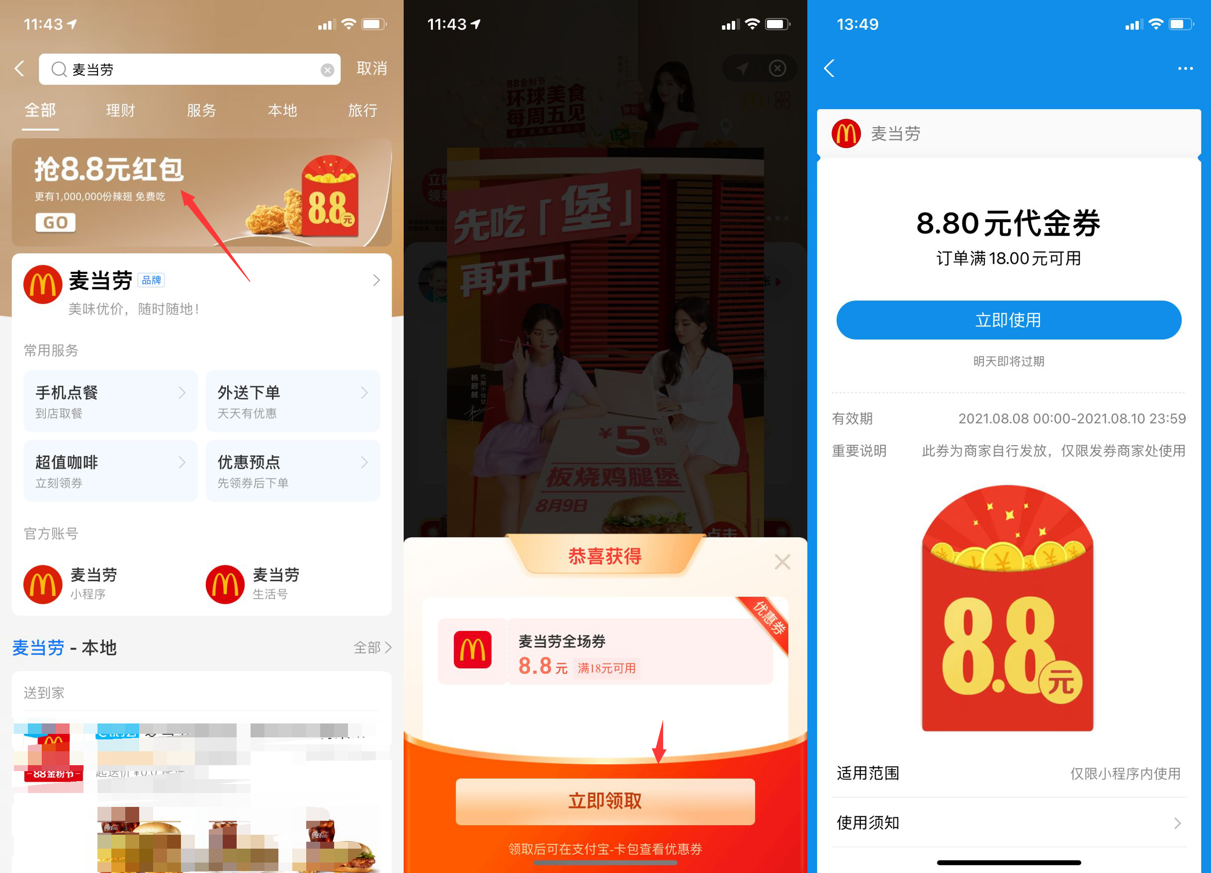 【免费领麦当劳8.88全场券】之前领过的还可以领!打开支付宝搜索“麦当劳”->横幅进去直接领取->附近有点店 最近要吃的领一手。