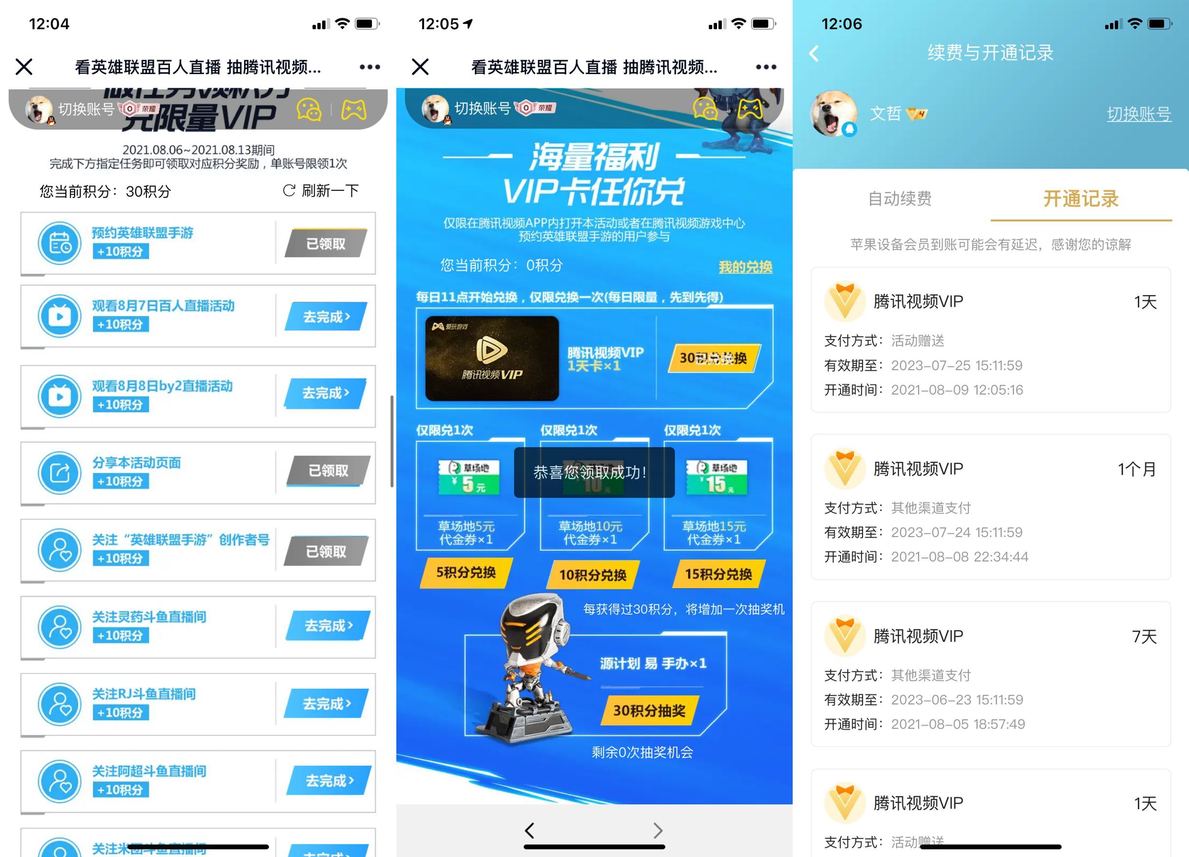 【英雄联盟手游领1天腾讯视频会员】打开链接->下拉做简单的任务->够30积分去兑换即可->QQ微信都可以参与!每天11点开始兑换 活动截止到13号->有需要的时候可以撸上!