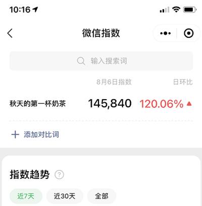 微信搜索指数秋天的第一杯奶茶热度在持续上升,并且还没有人做排名,如果这时候咱们弄号批量做了,肯定也能截取一大批流量。