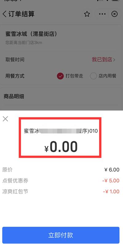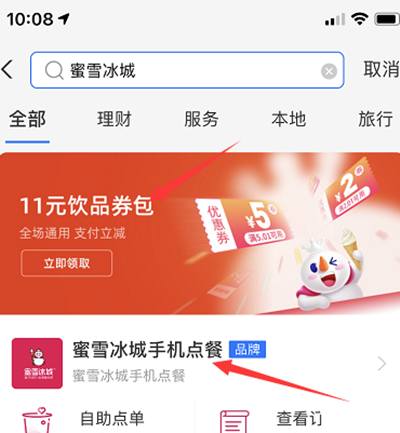 b、再搜索蜜雪冰城,然后点击进去领取红包,在选择产品,支付的时候会直接提示你