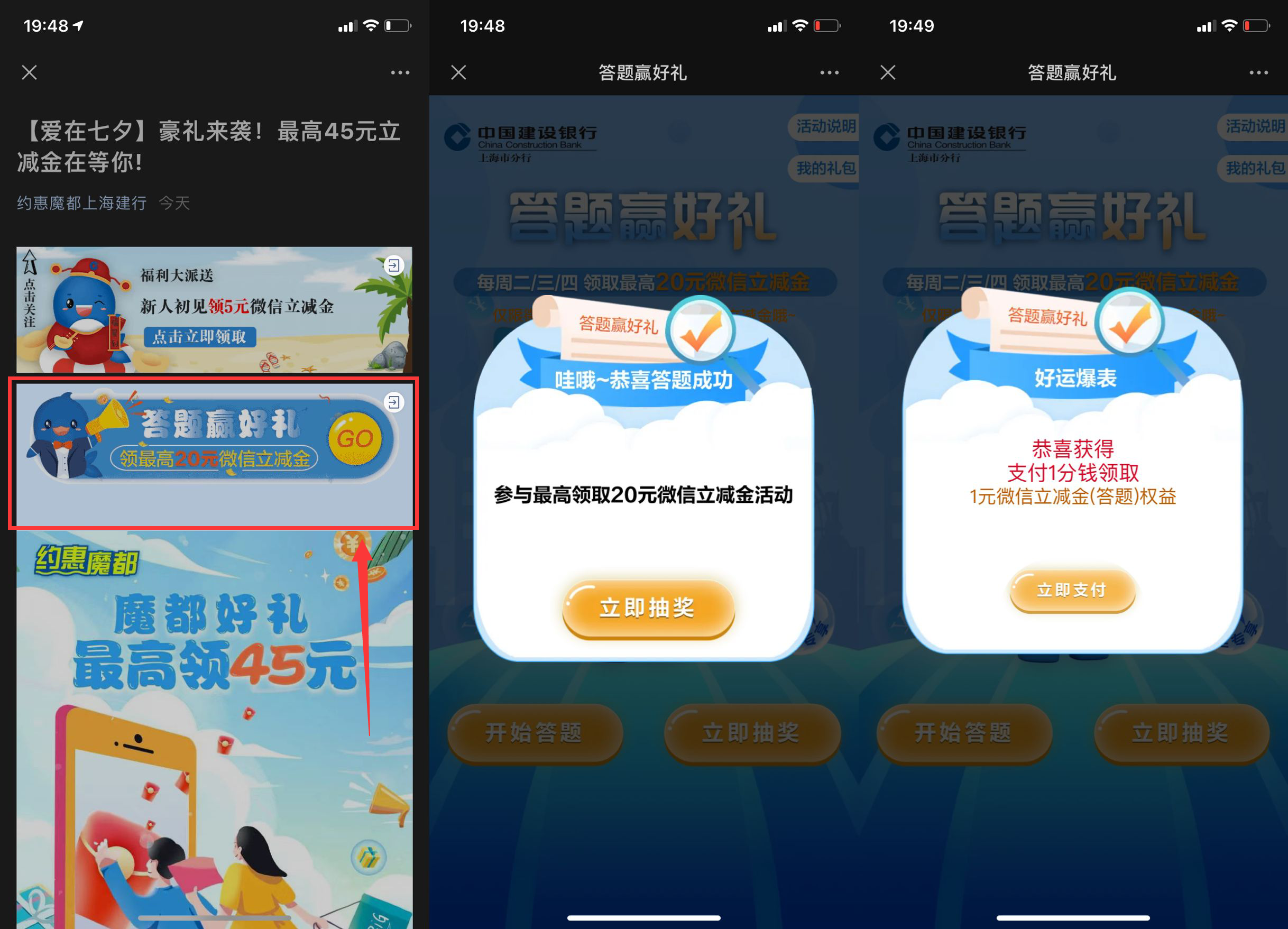 【建行卡抽1~2元微信立减金】新一期!微信打开点答题赢好礼进入活动->答题下面有答案->三道全对抽奖->抽中后支付1分领取!有建行卡的上