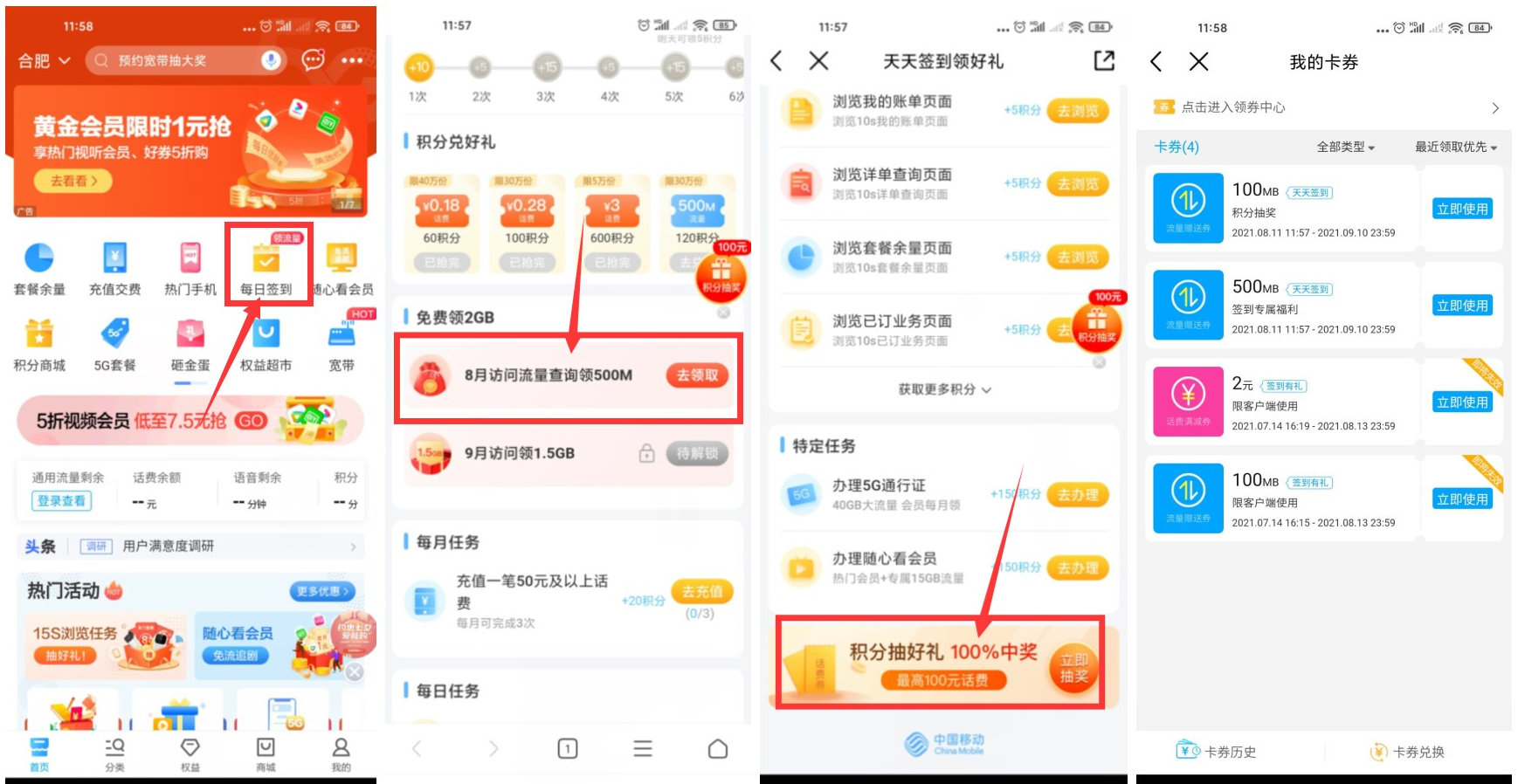 【移动领500M~1G日包流量】打开中国移动APP->首页上面“每日签到”->进来后如图点页面->领取后返回下拉到底“积分抽好礼”->还可以抽100M~500M流量->券有效期1个月->可以等用的时候再去卡券激活。