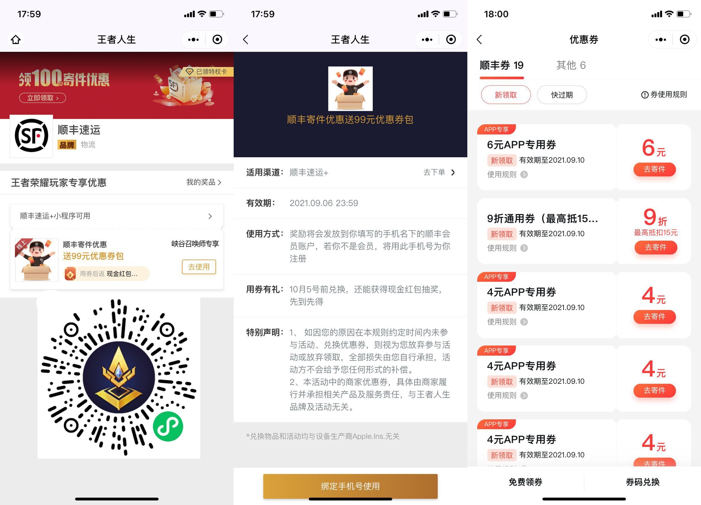 【免费领顺丰快递18元寄件组合券】可给任意号码兑换!包含无门槛4元三张和6元一张,微信扫码进入领取,然后按照提示兑换,券有效期1个月!经常寄快递的领了防身~
