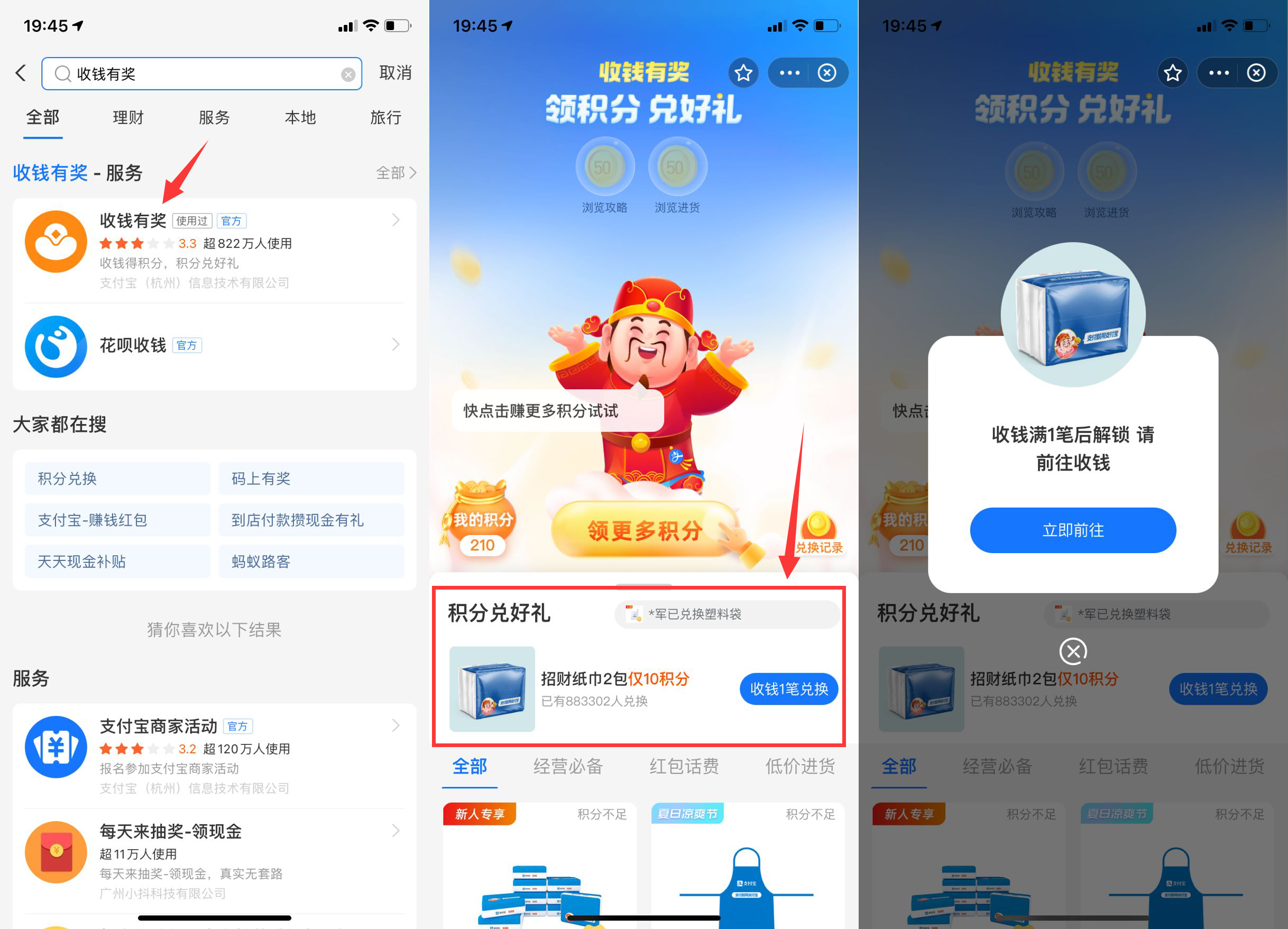 【支付宝免费撸2包抽纸】支付宝搜索“收钱有奖”->点进去后看有没有显示“招财纸巾2包”->有就按照提示收钱一笔就可以兑换->0元包邮到家!
