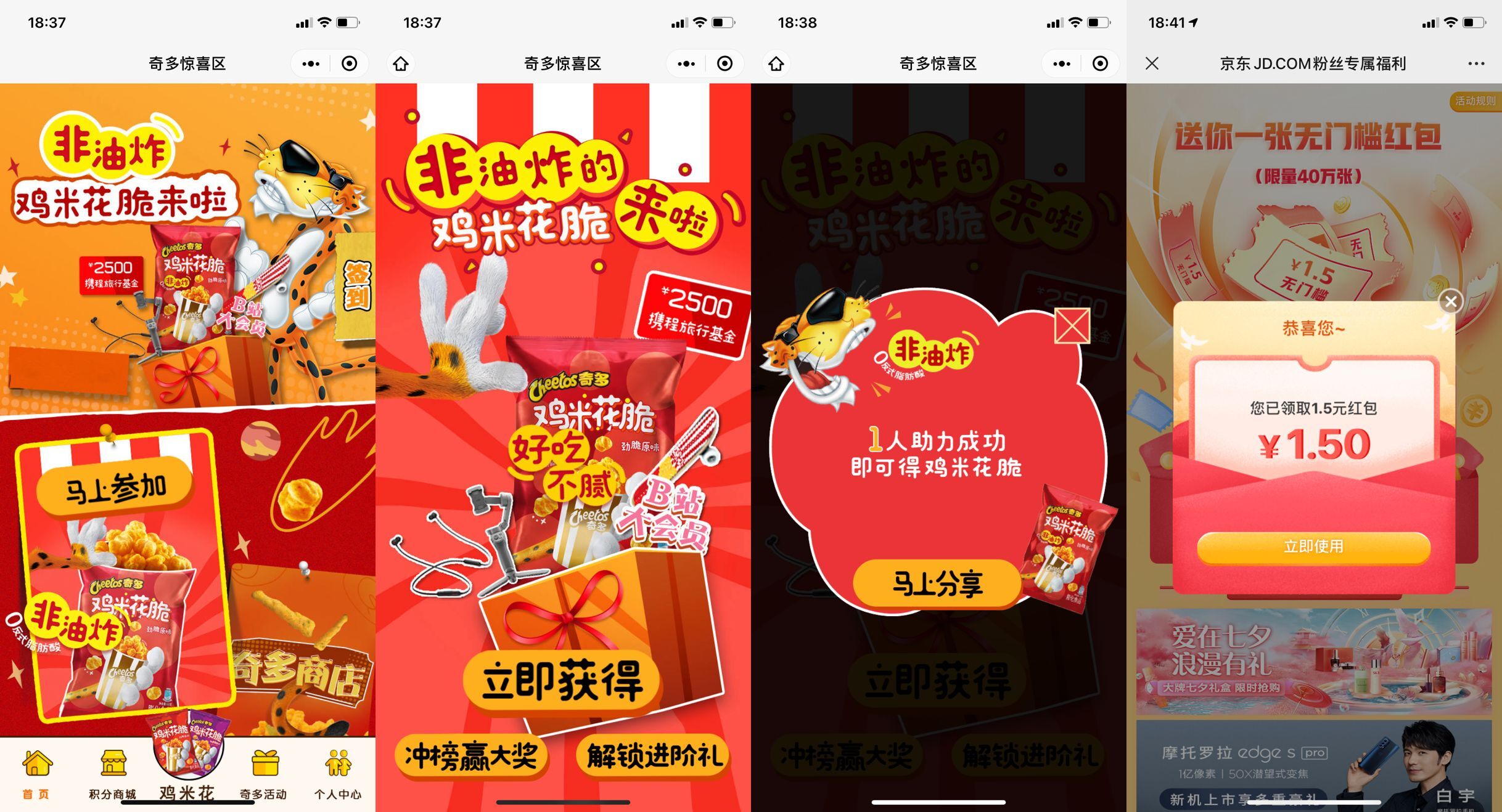 【免费领鸡米花零食一份】微信小程序搜索“奇多惊喜区”->马上参加->然后邀请一位好友助力即可包邮到家->邀请二个好友还能抽视频会员!-----【京东领1.5元购物红包】微信打开领取即可。