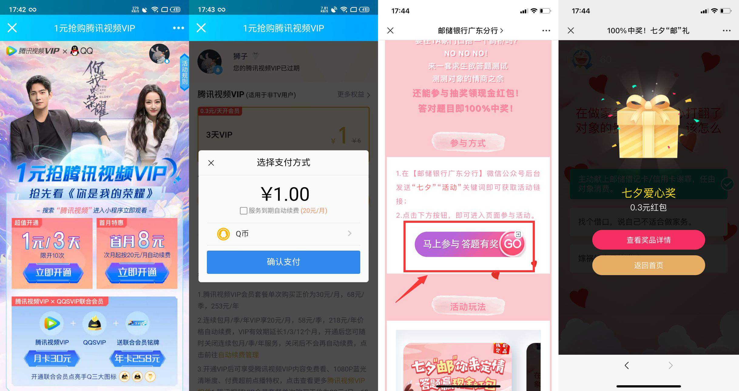 1元开3天腾讯视频会员+必中红包
