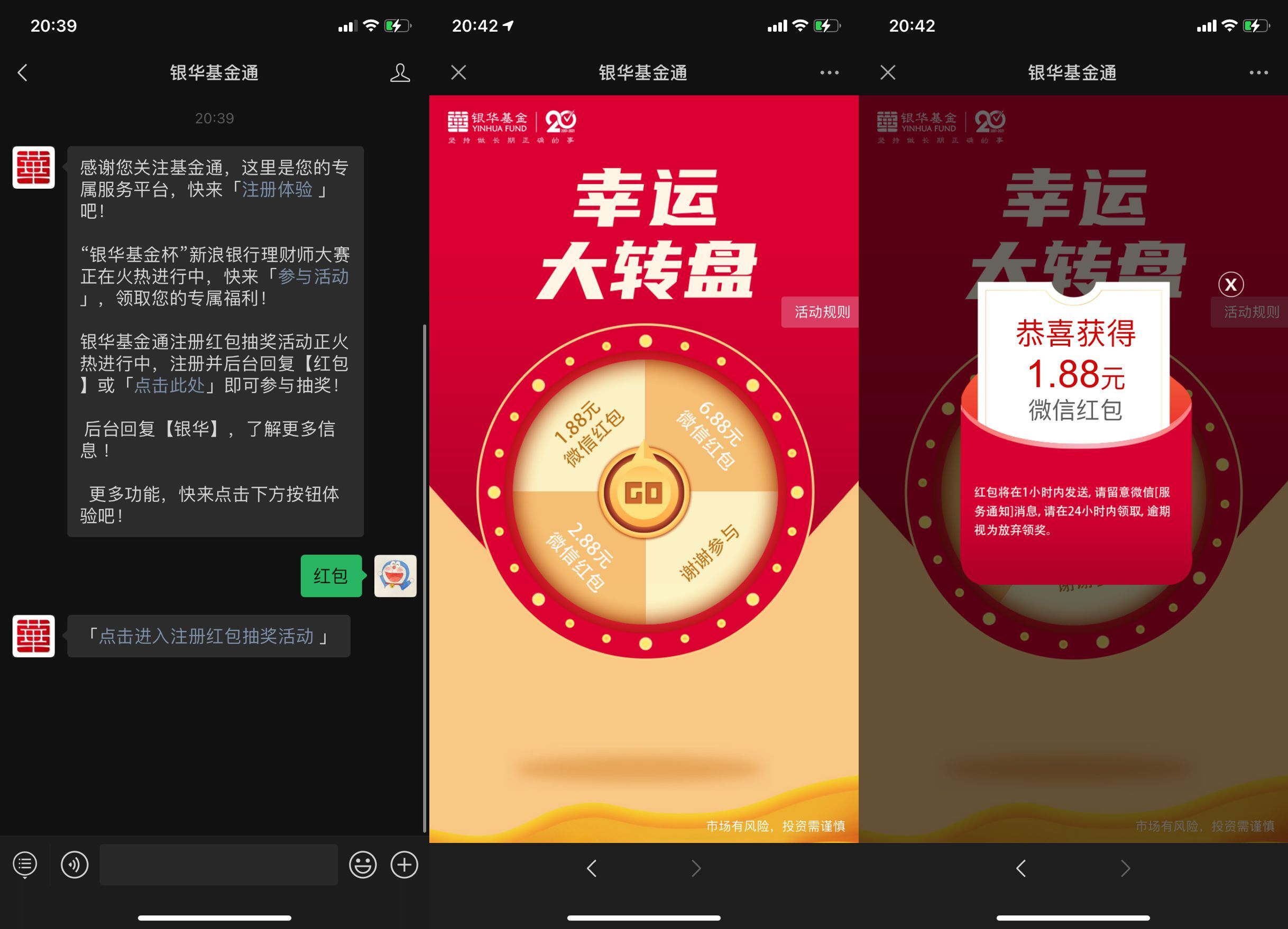 微信关注“银华基金通”->回复“红包”->点推文手机号注册登录->随便选择名字乱填提交->答题选对->然后抽亲测1.88元微信红包!不秒到。