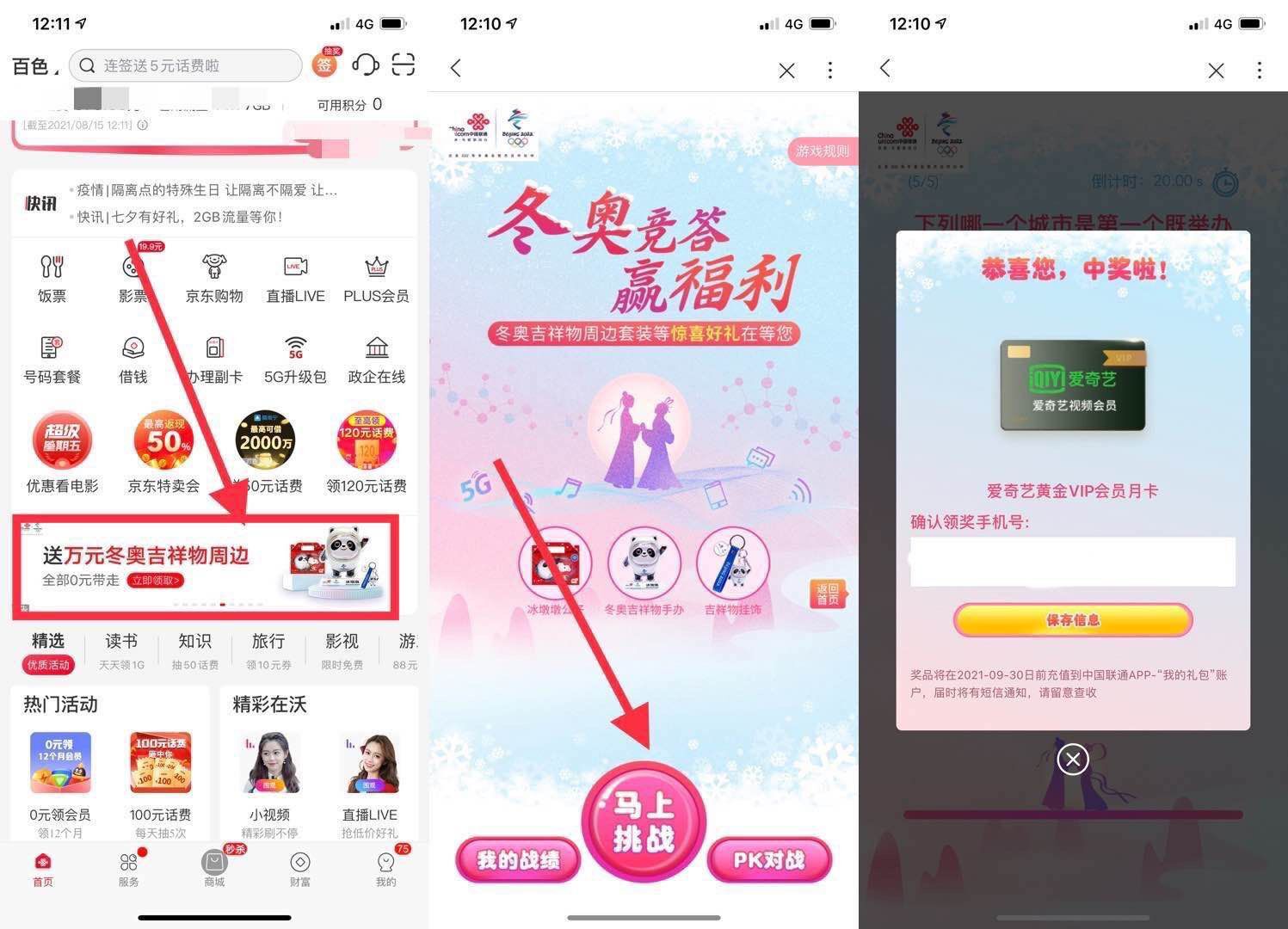 中国联通App->如图所示答题抽->群友亲测爱奇艺月卡!活动期间每天可玩!三次机会