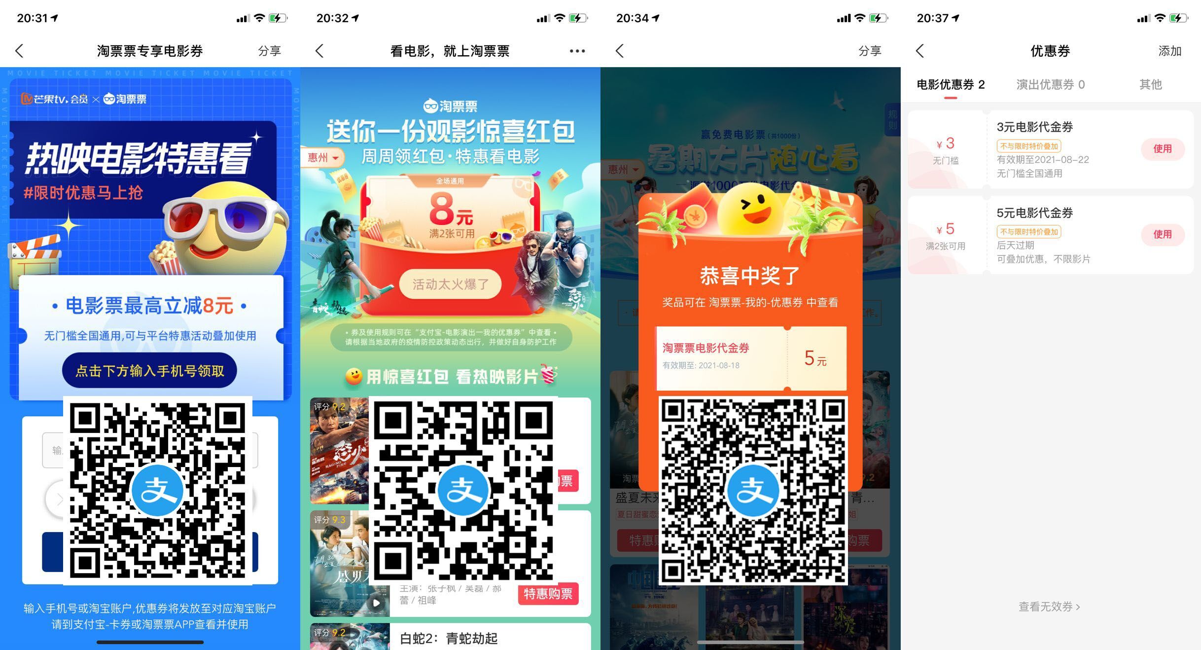 【淘票票领3~8元电影票抵扣券】打开支付宝依次扫码领取->领了后支付宝搜索“淘票票”->我的->优惠券即可看见->最近要看电影的可以领!