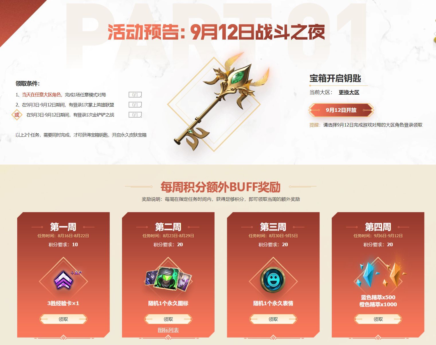 【LOL10周年战斗之夜领永久皮肤】完成任务获取积分兑换永久皮肤宝箱+宝箱开启钥匙,每周积分达到要求还有永久图标、表情蓝橙精粹等,经常玩LOL的铁子看看!
