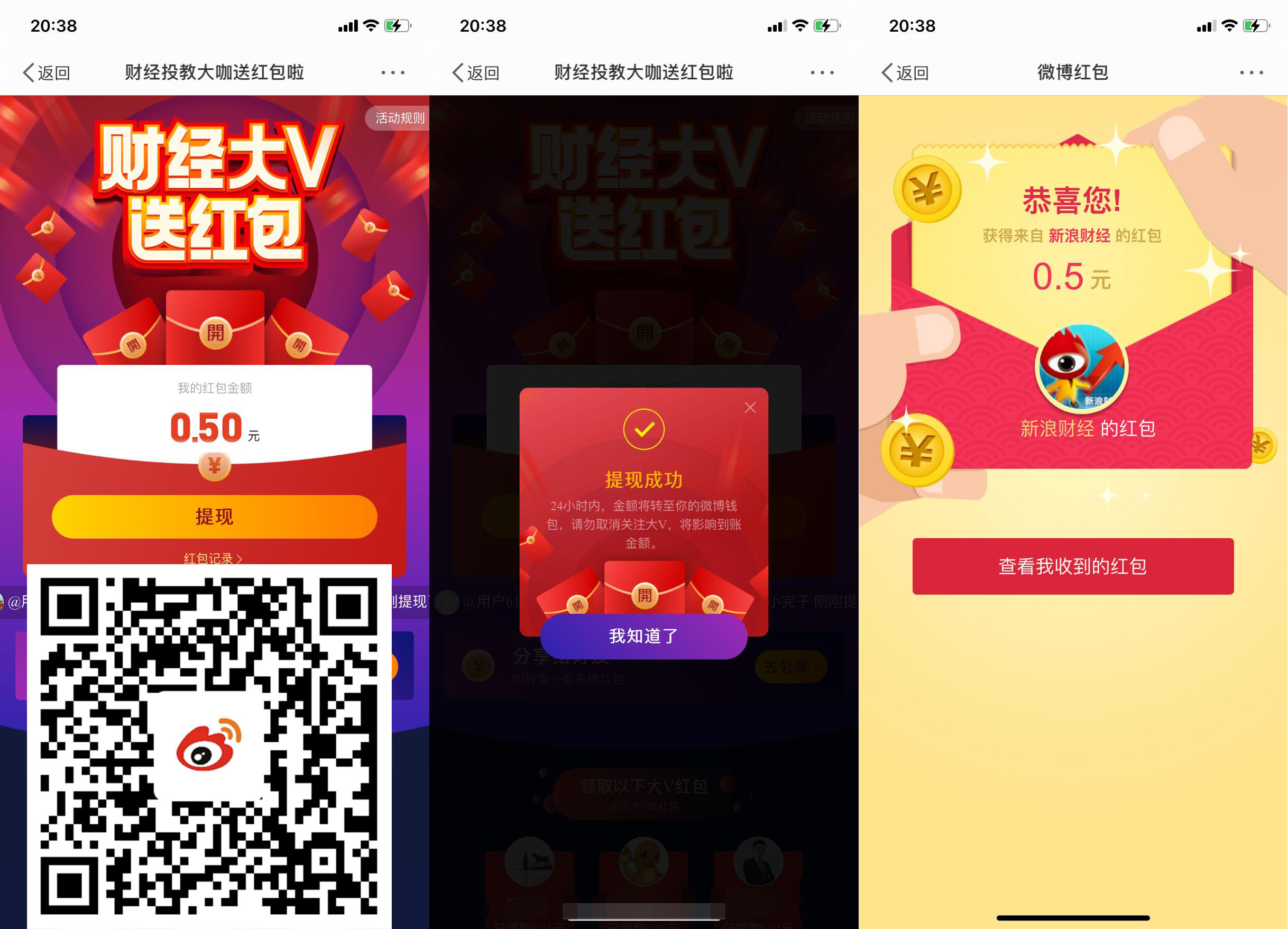 【微博关注大V领1~2元红包】打开微博APP扫码进入活动->领取红包全部都是1分->下拉全部都点完后->然后点页面提现->先提到微博钱包(不秒到)->等到了微博钱包再提到支付宝里!