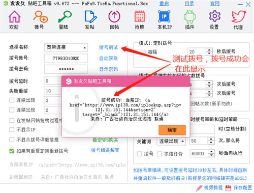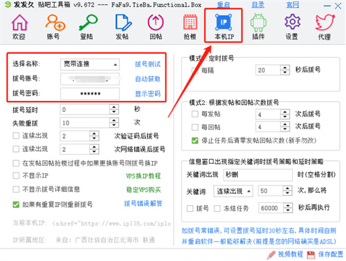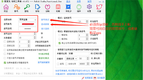 好,设置好发帖链接和顶贴内容之后,下面讲解下关于ip问题。首先ip如果自己家拉有宽带的,直接可以宽带拨号自动换ip操作就行了。