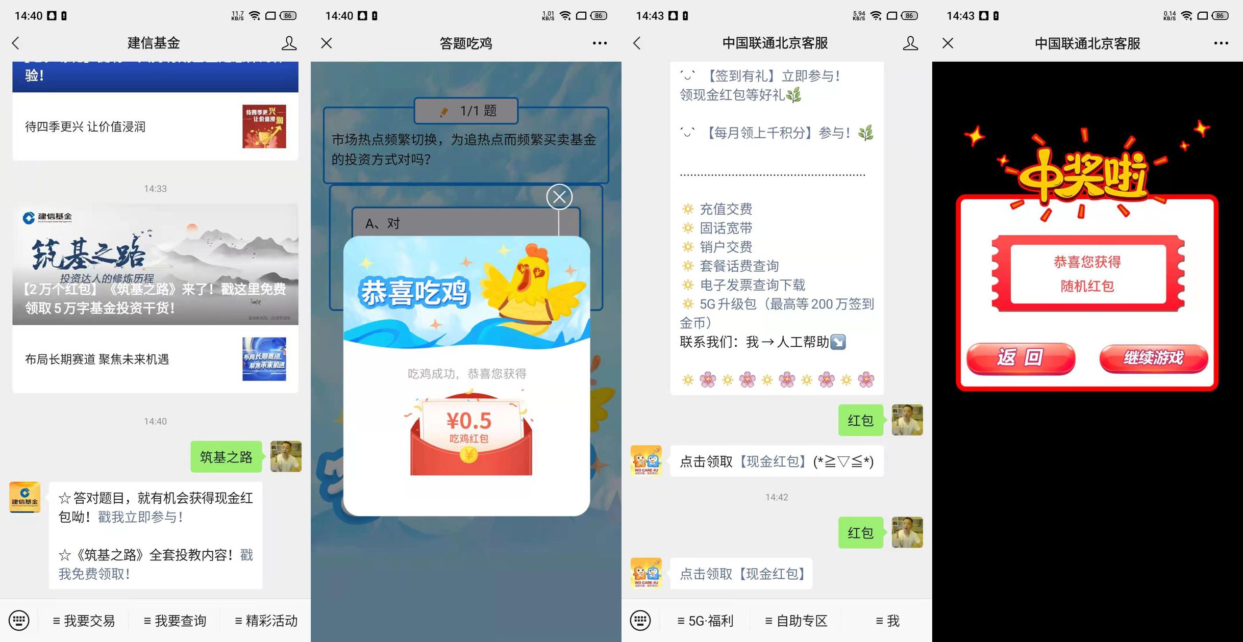 微信关注“建信基金”回复“筑基之路”->点推文参与答题选不对->号码乱填,亲测0.5元微信红包!非必中不中换号!=====微信关注“中国联通北京客服”回复“红包”->点推文参与机会用完->限制联通用户!非必中!