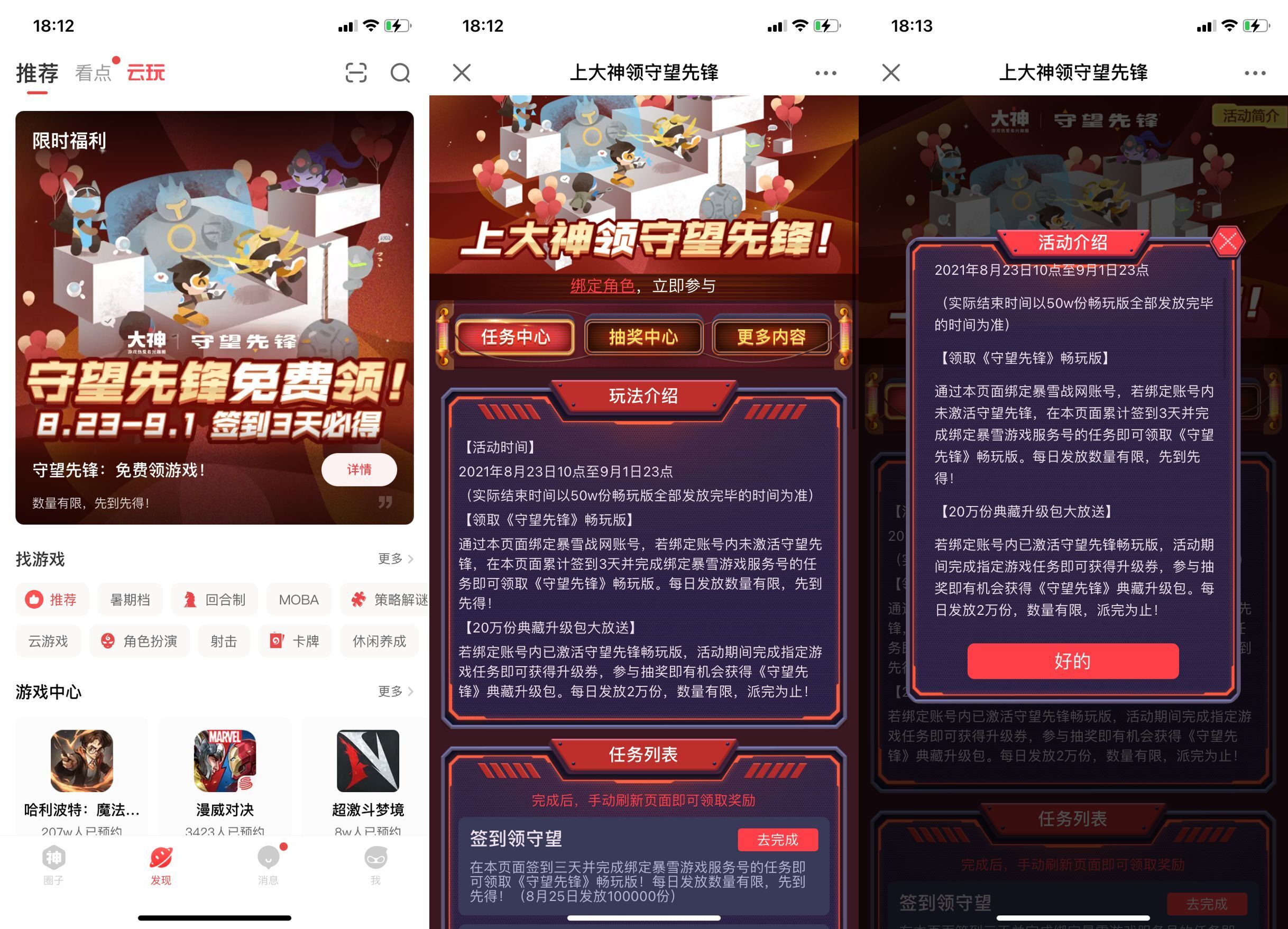 【网易大神领守望先锋畅玩版】下载网易大神APP->发现->顶部“守望先锋免费领”->进去参加活动->连续签到3天即可获得->每天限量!总共50W份应该蛮好领的!