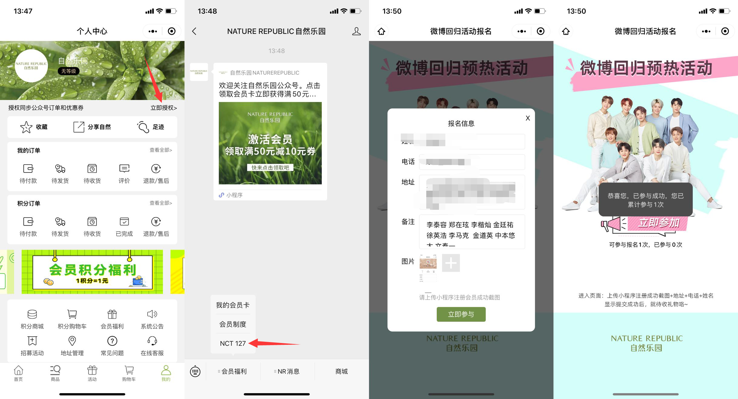 【自然乐园免费领洗面奶】微信搜索“自然乐园”小程序第一个进入->点我的上面立即授权->成为会员截下图->然后去图中公众号->点左下角会员福利->NCT 127->立即参加,填写信息上传截图
