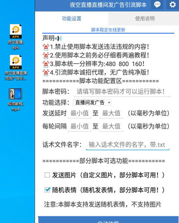 使用这款脚本可以自动在直播间发广告,就当是自动私信各个主播了,测试模拟器没限制,消息主播门都可以看得到。效果挺好的。
