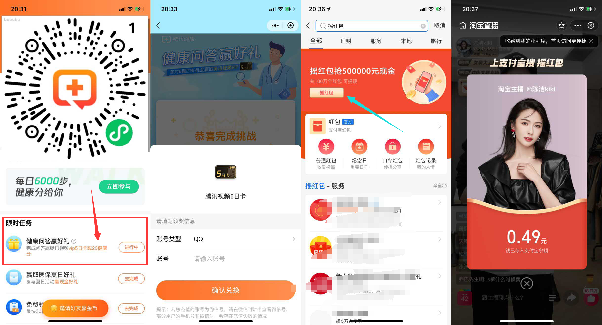 【支付宝抽随机红包】支付宝APP搜索“摇红包”进入活动->摇晃手机有资格的就会提示进入直播间->然后等待15秒结束后点击红包领取即可!