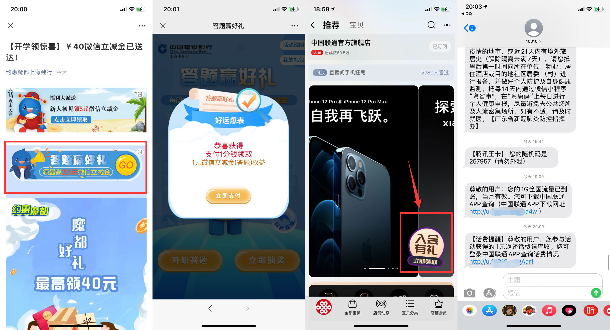【建行卡抽1~2元微信立减金】新一期!微信打开点答题赢好礼进入活动->答题下面有答案->三道全对抽奖->抽中后支付1分领取!有建行卡的上