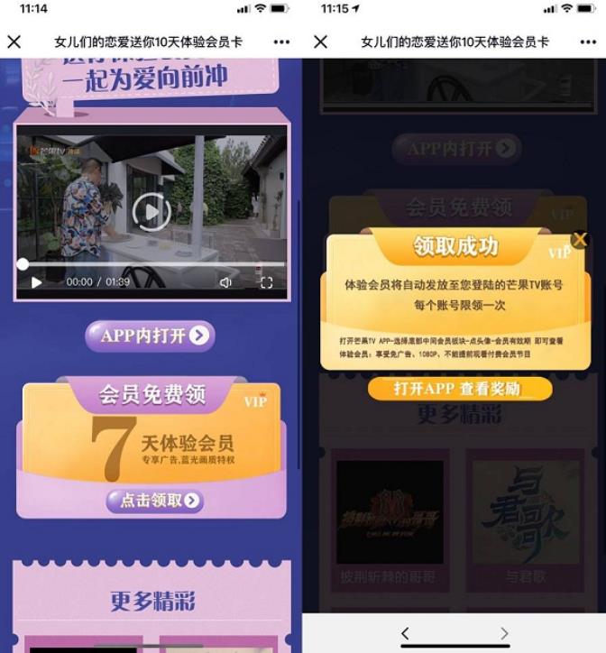 手机打开链接进入活动 登录芒果TV账号即可免费领取7天体验会员可免广告 有需要的小伙伴们可以去领取一下!