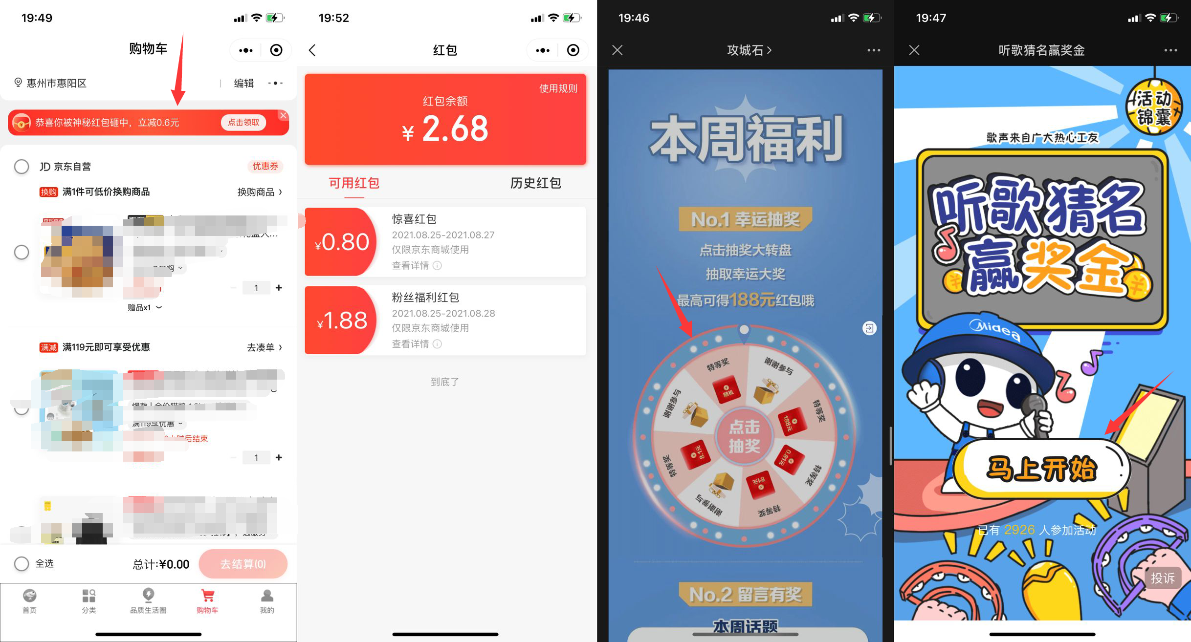 【京东抽2.48元无门槛购物红包】微信小程序搜索“京东购物”->去底部购物车->看顶部有没有0.6元红包!->领了后直接给的是0.8元->再微信打开这个链接直接抽!