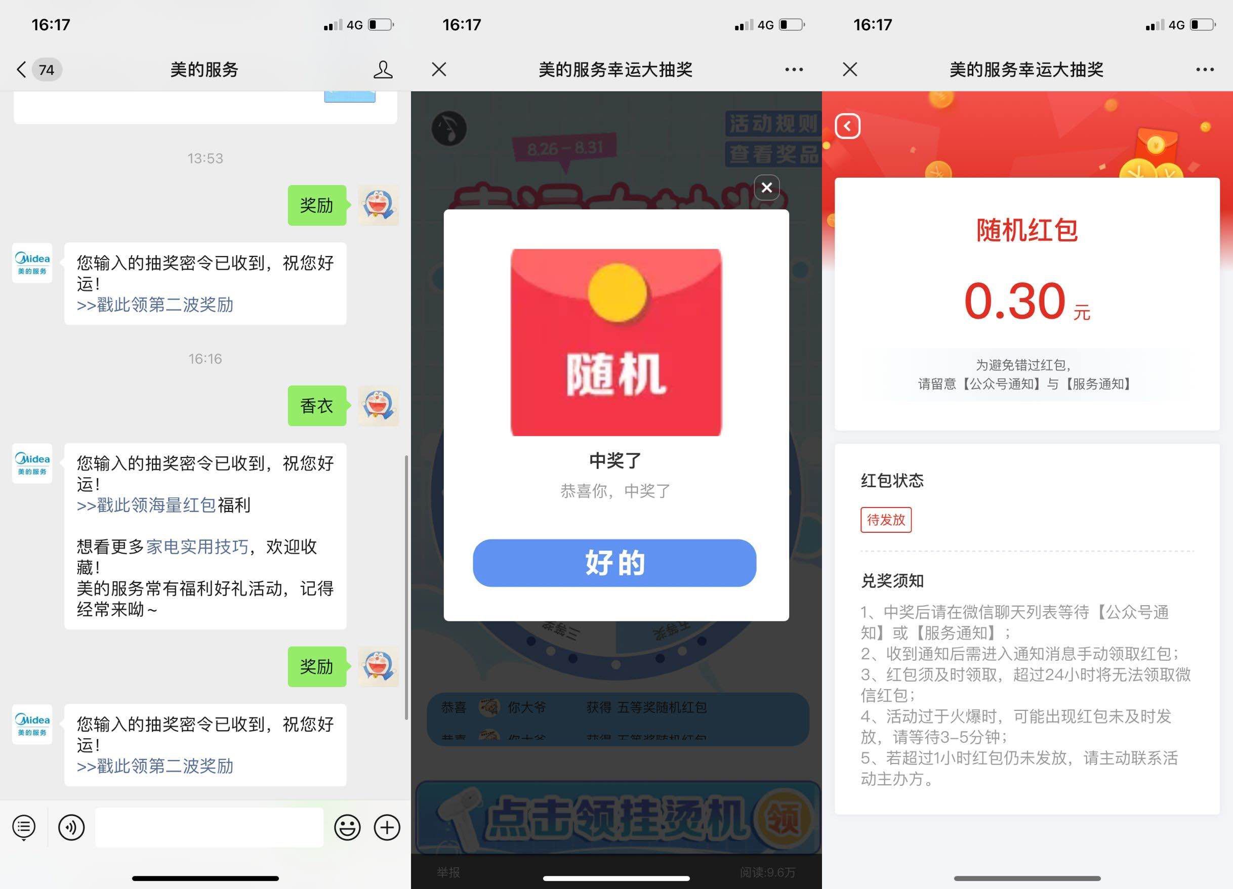 微信关注“美的服务”->发送“香衣”和“奖励”->点推文海量红包和第二波奖励进去->第一个下拉页面点GO进入抽红包->中了不秒到!