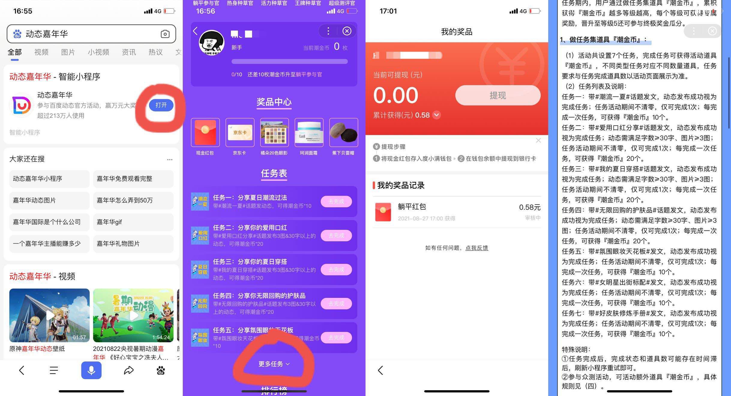 【百度抽随机现金红包】打开百度APP搜索“动态嘉年华”->潮流一夏->进去下拉页面->做7个任务(点击更多会展开)->有几个任务是要达到30字和3张图片才能完成->做完后回到上面点满10枚、满30枚依次抽奖!仔细看规则