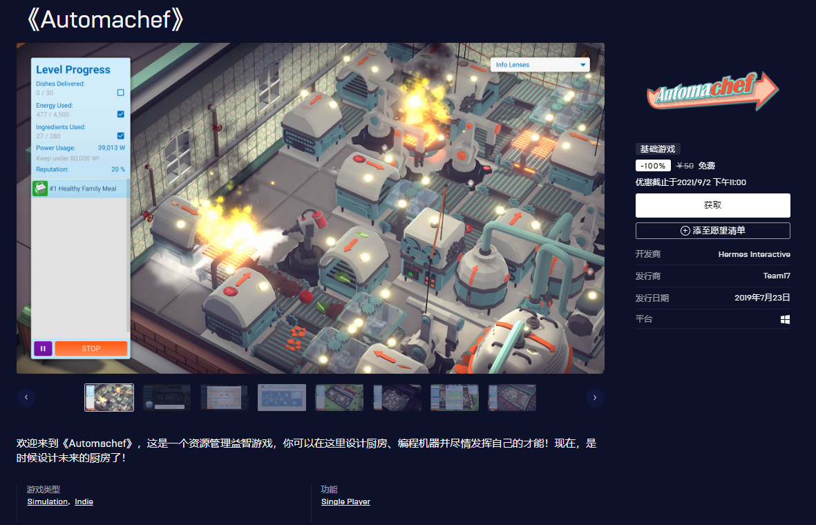 Epic免费喜加一【自动机器大厨】->一个资源管理益智游戏,您可以在这里设计厨房、编程机器并尽情发挥自己的才能!设计未来的厨房,领取时间截止9/2日。
