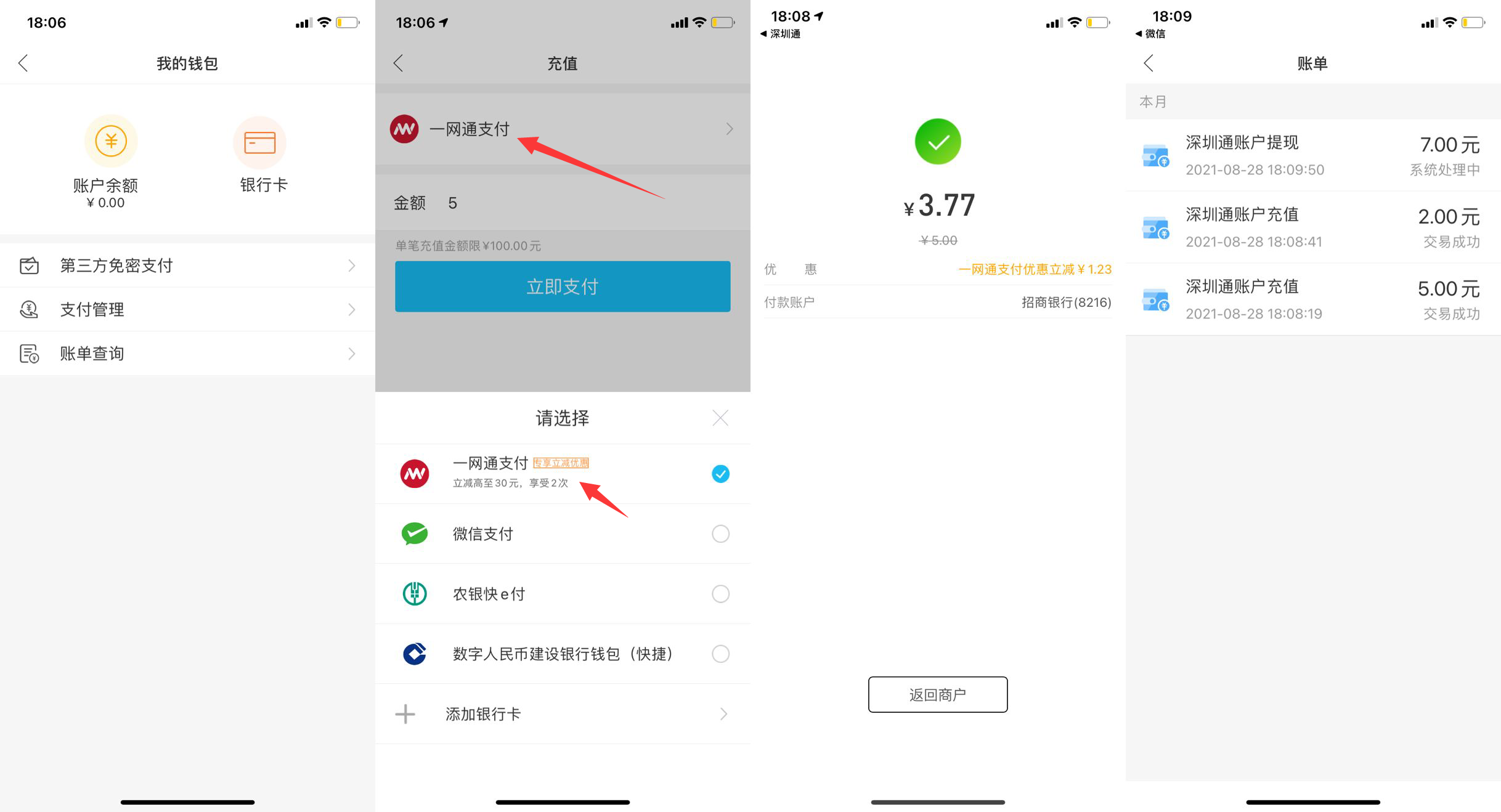 【招行用户领2~5元微信零钱】新一期!应用商店下载“深圳通”->注册登录->我的->钱包->余额->充值5元->手动点“一网通支付”->显示立减就充值!付完款才能看到立减->充2次!然后提现即可->不秒到下周到!