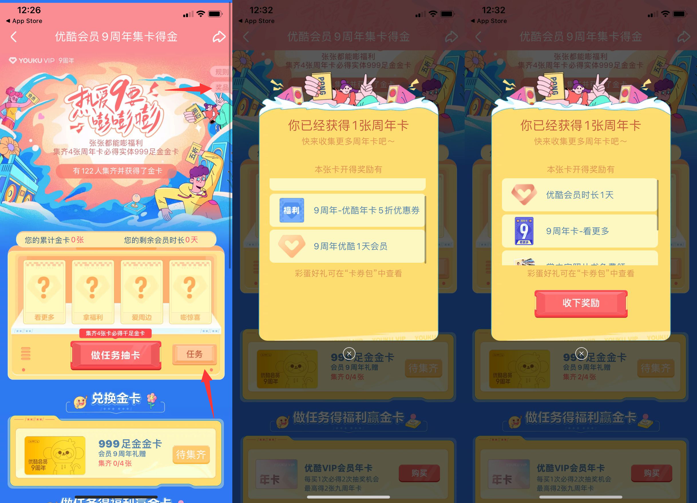 【优酷抽随机天数会员】浏览器打开链接跳转到优酷APP参加->进来后下拉页面->做下面的几个观看任务->然后回到上面抽周年卡->基本每次必中最少1天会员->运气好中网易云会员->4个观看任务做完4次机会->明天和后天还可以抽!