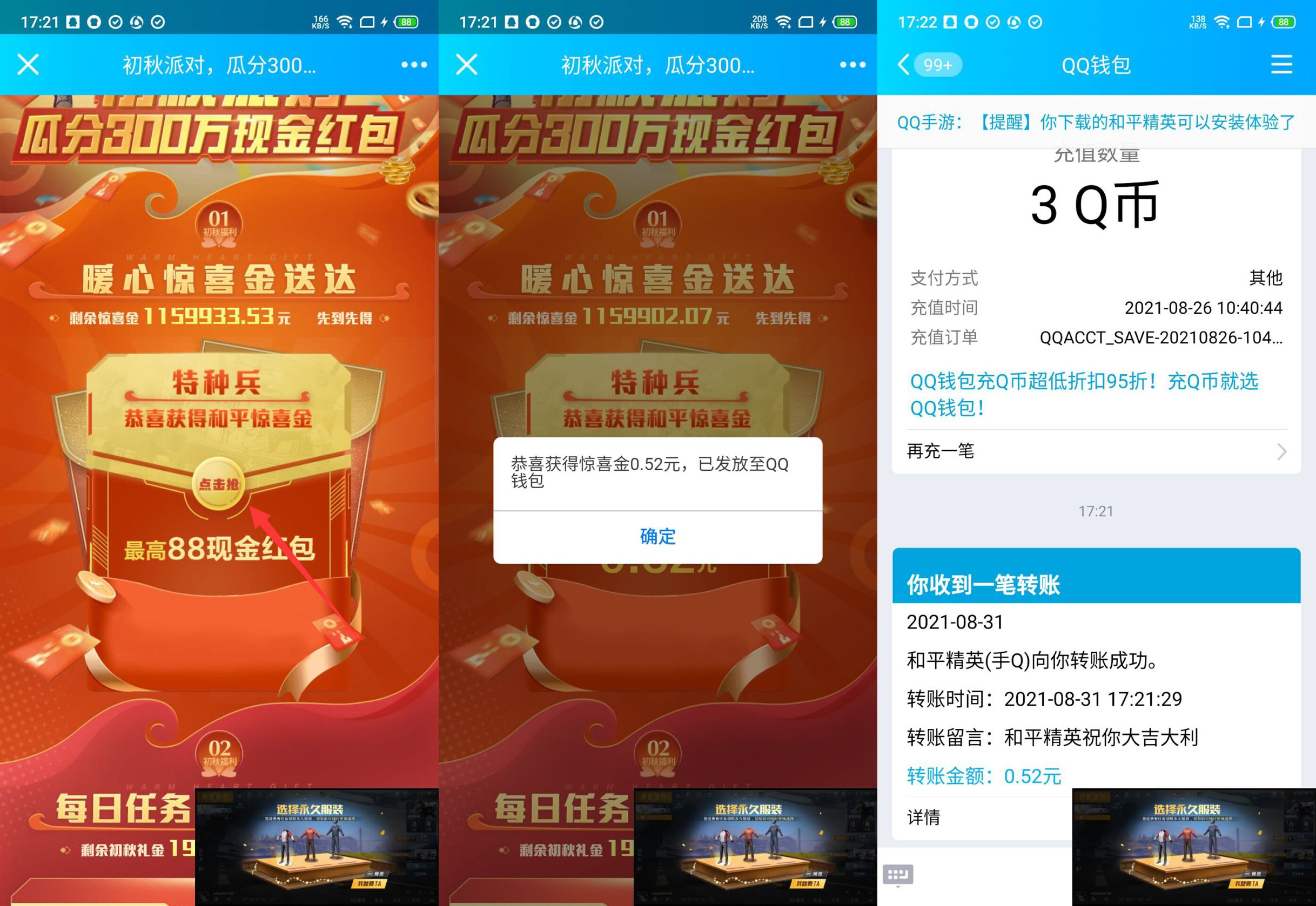 【和平精英领随机红包】手机里没有游戏的用先游APP登录下(这样无需下游戏)->登录后就返回活动点击抢->亲测0.52元QQ红包!