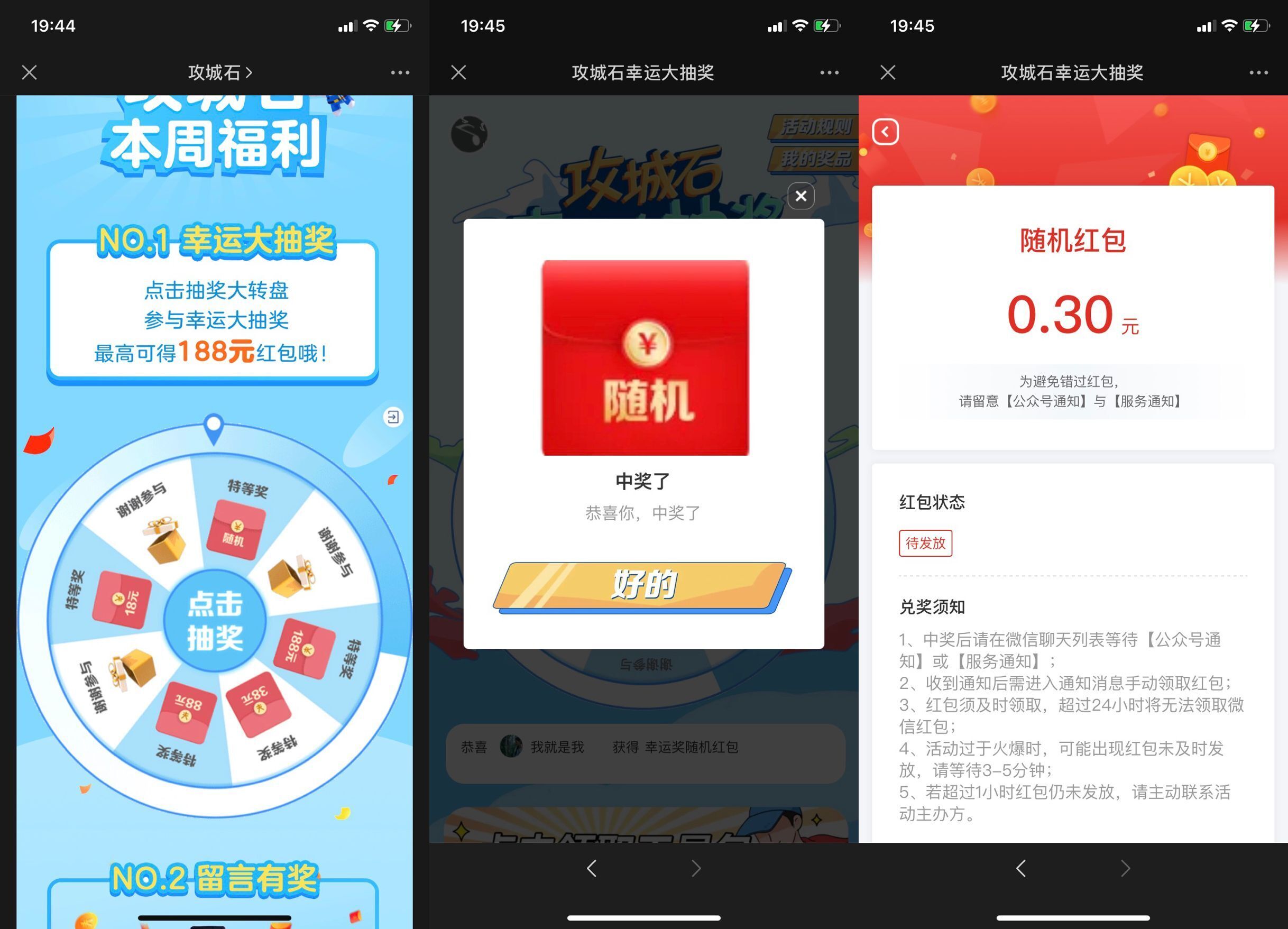 新一期!攻城石抽随机红包->微信打开下拉点图转盘参与->亲测0.3元微信红包不秒到!