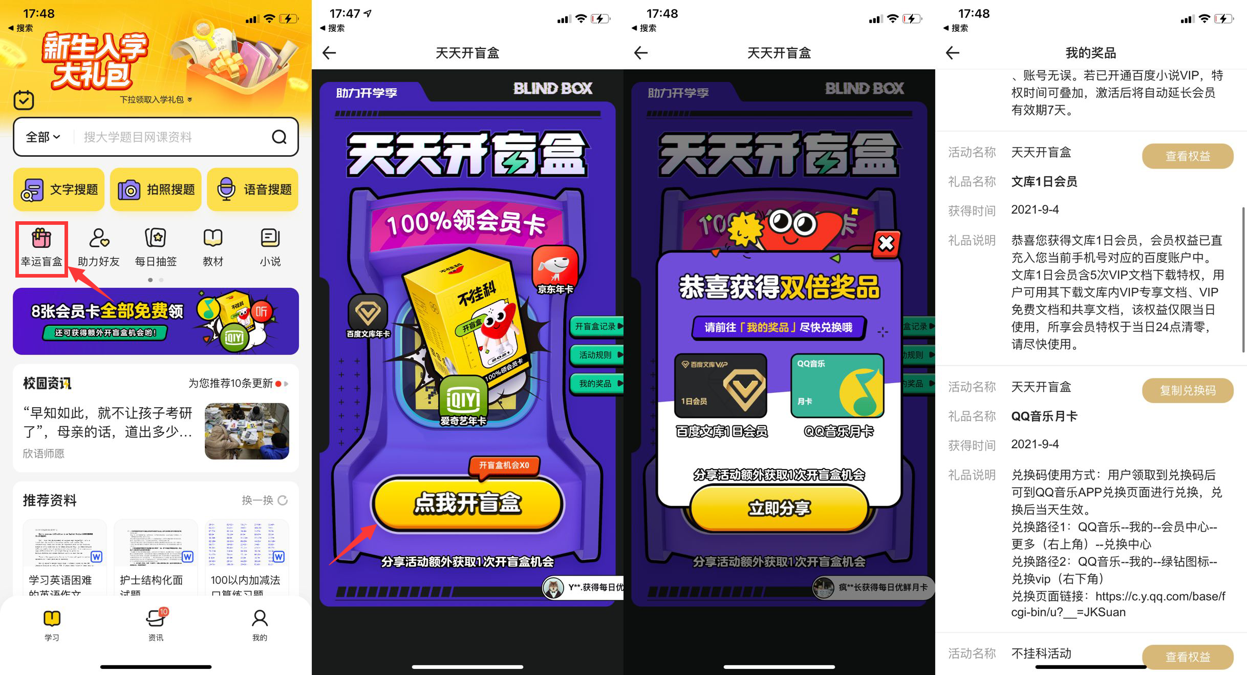 【不挂科抽爱奇艺QQ音乐会员】今天才出来的新活动!应用商店搜索下载不挂科APP->登录后点首页->幸运盲盒->保底最少中1天百度文库会员->运气好就中其它会员->随便分享还有一次机会->活动时间内每天可抽!亲测中了绿砖月卡~