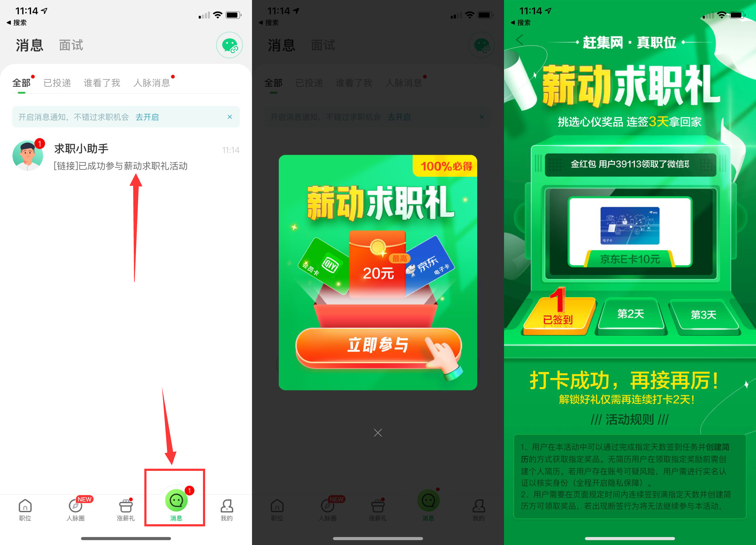 【赶集网老用户领10元E卡】部分新人也有,应用商店下载“赶集网直聘”->点底部消息->就会弹窗出“薪动求职礼”->进去选择红包或者E卡->打卡三天即可领取!后两天签到从消息->招聘小助手进入!没入口的用这个链接进入试试!