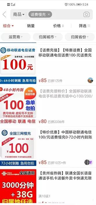 话费慢充的渠道可以去某宝或某夕夕上直接搜索就可以了,这是最安全的渠道,其他渠道或多或少有一点的安全隐患,在这里就不做推荐。如果用某宝或某夕夕去做操作这个项目的话,可能少赚一点钱,但资金是绝对的安全。下图是某夕夕上搜索的,看上去价格是80多,实际都是95左右,月初价格要贵点。