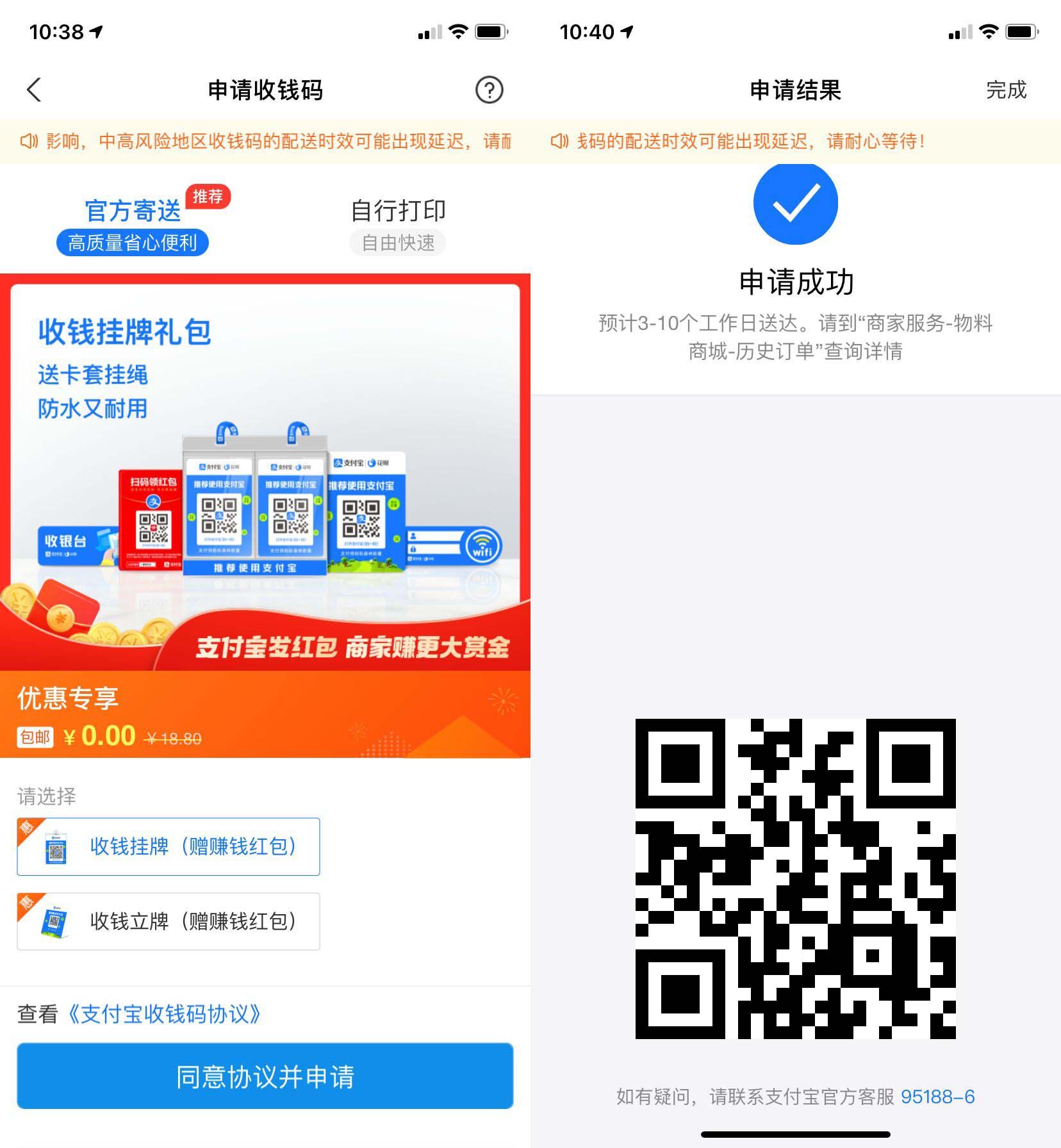【免费领支付宝商家收款挂牌礼包】打开APP扫码进入->显示是0元就直接申领就行->申领后会免费给你寄过来->部分人领过的就不会显示0元!
