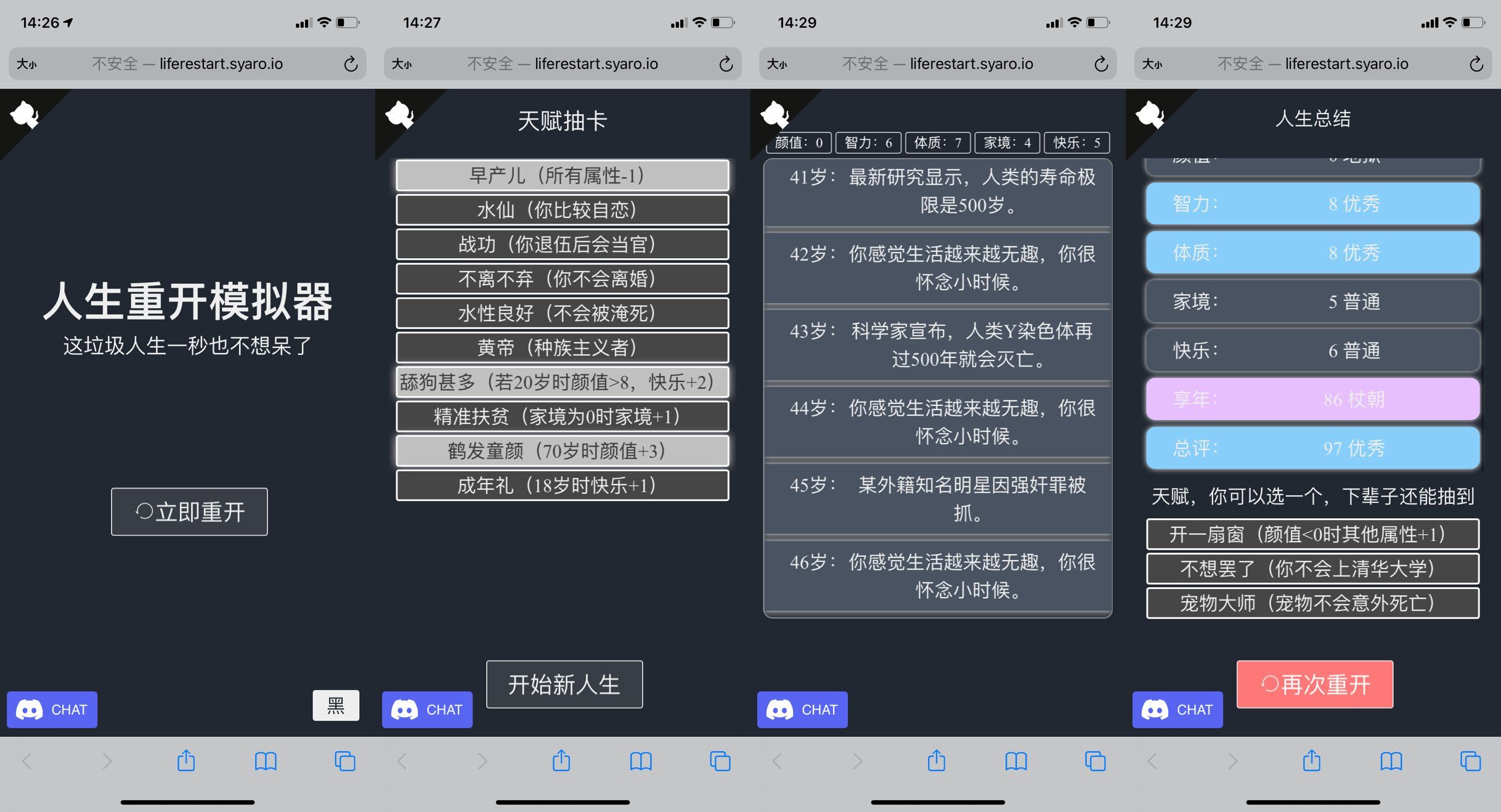【干货分享】人生重开模拟器 一款网页文字游戏,能让你体验重新开始的人生!挺魔性搞笑的,无聊可以玩玩~=====原版https://sourl.cn/pvU2Du 我是人上人版https://sourl.cn/UkxQHp