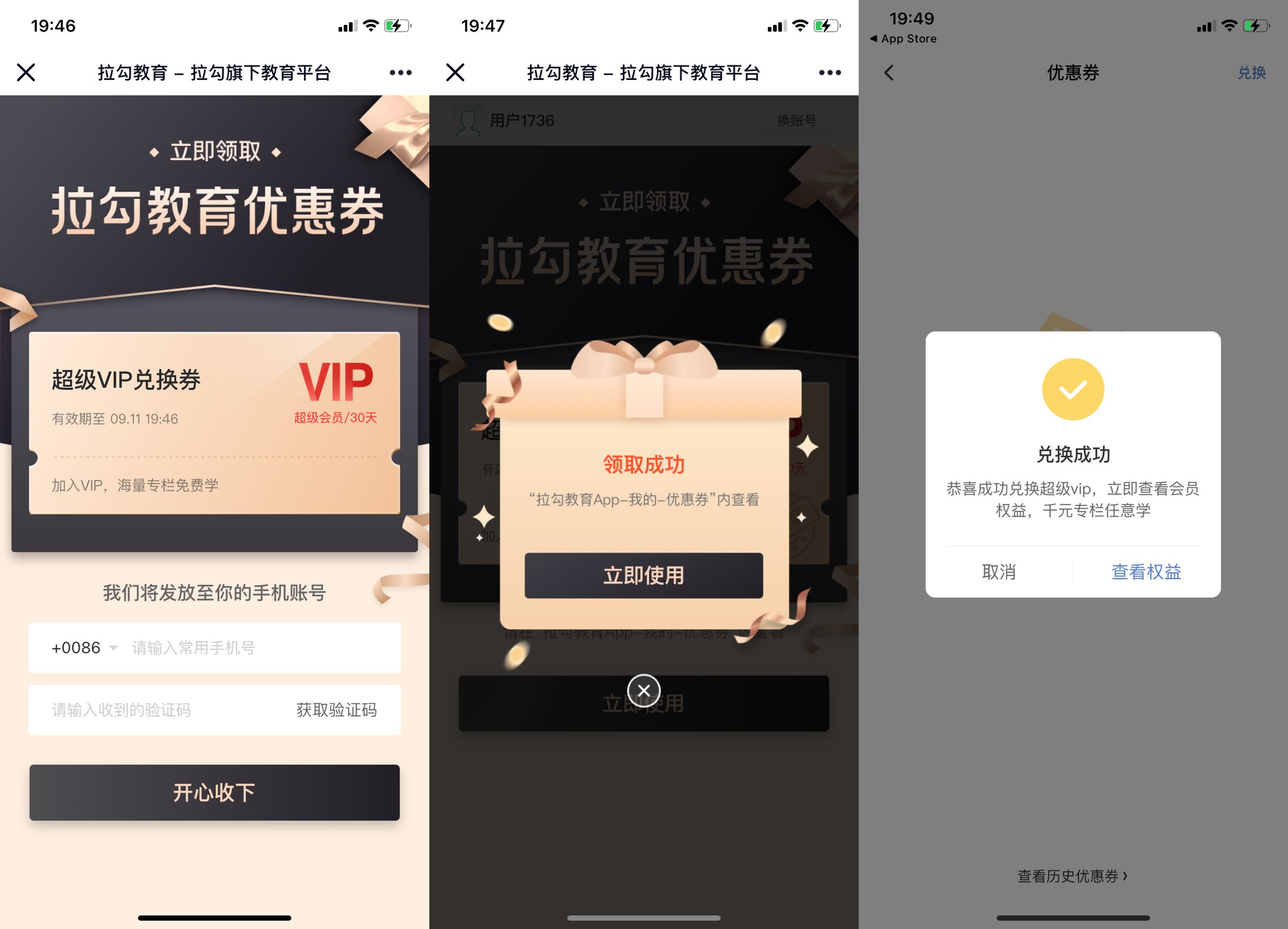 【免费领拉钩教育会员月卡】一款互联网教育学习平台,提供大量的名师课程!打开地址领取成功后再点开心收下,然后下载拉钩教育APP,我的,优惠券点击使用激活即可!