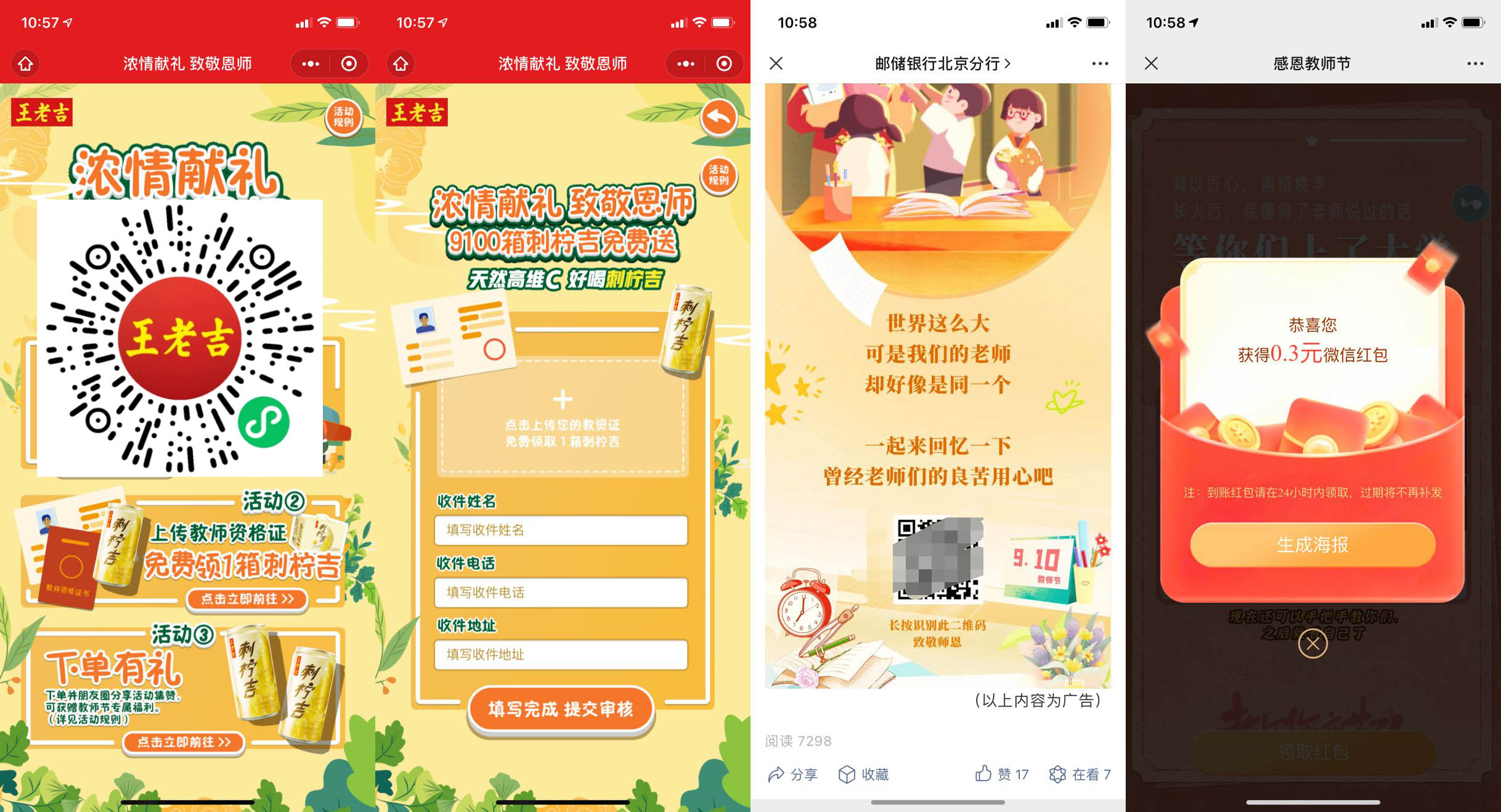【教师免费领1箱王老吉刺柠吉】微信扫码进入活动->点活动2进入按照填写->等待审核成功即可!不是老师的铁汁分享给身边的人~
