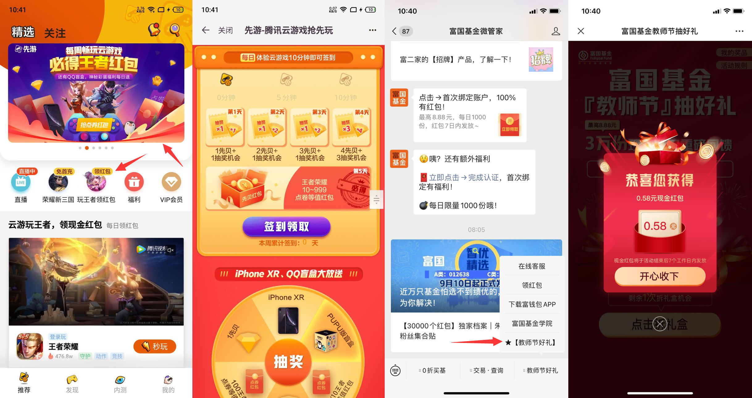 2、【抽0.58元微信红包】微信关注“富国基金微管家”->点开右下角->教师节好礼->两次机会抽->中了7天内推包->部分需要认证就无视!