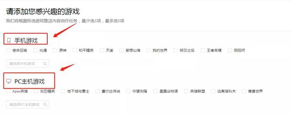 登陆进去后,需要选择游戏,他分为手游和PC游戏,最少选3个,最多5个,如果主页没有你要找的游戏,可以通过搜索栏,输入游戏名就可以找到了;